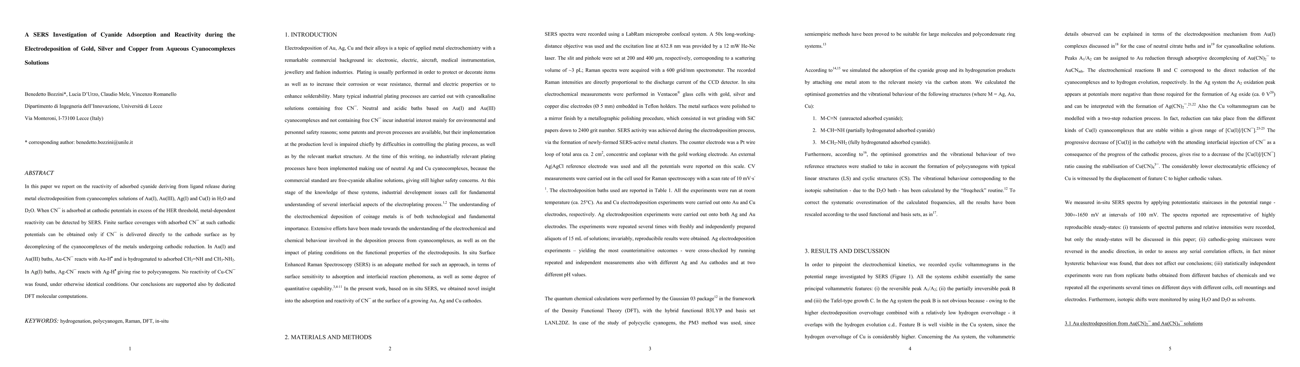In this paper we report on the reactivity of adsorbed cyanide deriving from ligand release during metal electrodeposition from cyanocomplex solutions of Au(I), Au(III), Ag(I) and Cu(I) in H2O and D2O. When CN is adsorbed at cathodic potentials in excess of the HER threshold, metal-dependent reactivity can be detected by SERS. Finite surface coverages with adsorbed CN at such cathodic potentials can be obtained only if CN is delivered directly to the cathode surface as by decomplexing of the cyanocomplexes of the metals undergoing cathodic reduction. In Au(I) and Au(III) baths, Au-CN reacts with Au-H and is hydrogenated to adsorbed CH2=NH and CH3-NH2. In Ag(I) baths, Ag-CN reacts with Ag-H giving rise to polycyanogens. No reactivity of Cu-CN was found, under otherwise identical conditions. Our conclusions are supported also by dedicated DFT molecular computations.