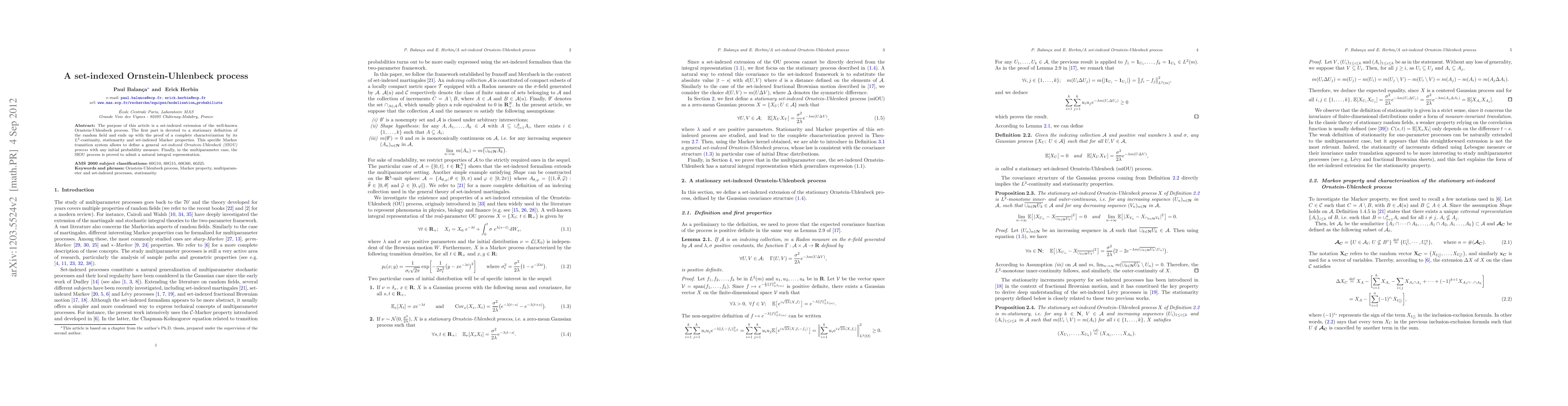 This paper extends the Ornstein-Uhlenbeck process to a set-indexed framework, defining a stationary random field characterized by $L^2$-continuity, stationarity, and set-indexed Markov properties. The set-indexed Ornstein-Uhlenbeck (SIOU) process is shown to have a natural integral representation in the multiparameter case.
