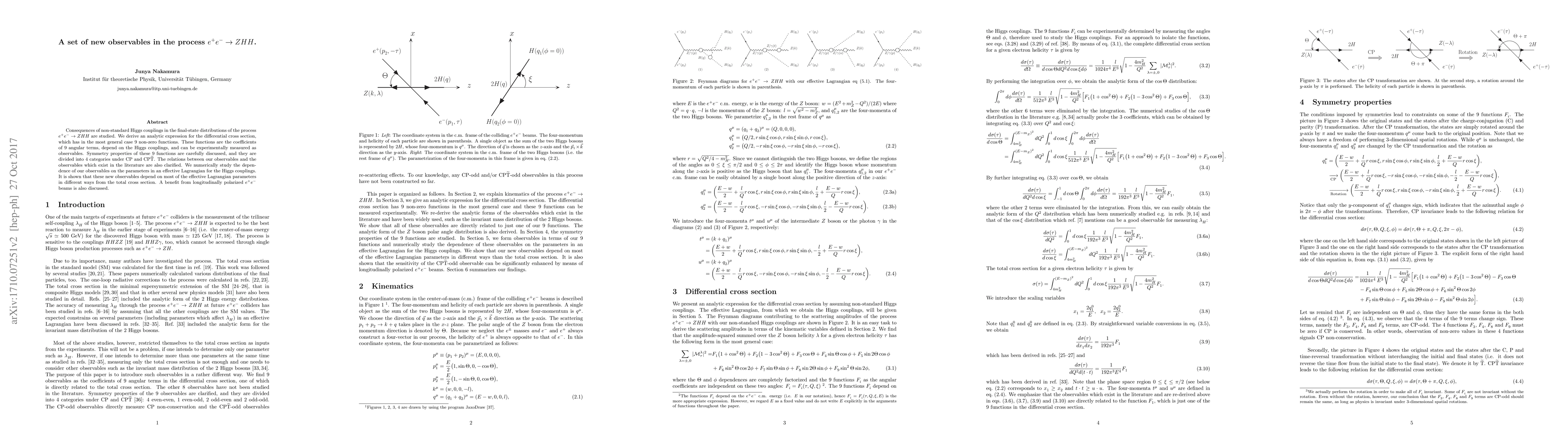 Consequences of non-standard Higgs couplings in the final-state distributions of the process $e^+_{}e^-_{} \to ZHH$ are studied. We derive an analytic expression for the differential cross section, which has in the most general case 9 non-zero functions. These functions are the coefficients of 9 angular terms, depend on the Higgs couplings, and can be experimentally measured as observables. Symmetry properties of these 9 functions are carefully discussed, and they are divided into 4 categories under CP and $\mathrm{CP\tilde{T}}$. The relations between our observables and the observables which exist in the literature are also clarified. We numerically study the dependence of our observables on the parameters in an effective Lagrangian for the Higgs couplings. It is shown that these new observables depend on most of the effective Lagrangian parameters in different ways from the total cross section. A benefit from longitudinally polarized $e^+_{}e^-_{}$ beams is also discussed.