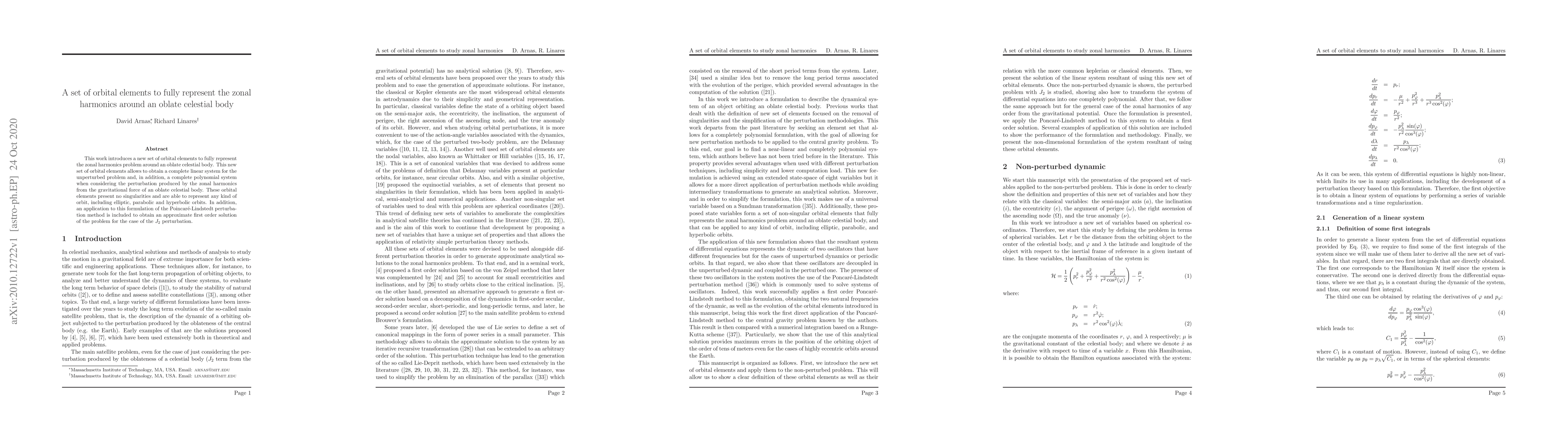 This work introduces a new set of orbital elements to fully represent the zonal harmonics problem around an oblate celestial body. This new set of orbital elements allows to obtain a complete linear system for the unperturbed problem and, in addition, a complete polynomial system when considering the perturbation produced by the zonal harmonics from the gravitational force of an oblate celestial body. These orbital elements present no singularities and are able to represent any kind of orbit, including elliptic, parabolic and hyperbolic orbits. In addition, an application to this formulation of the Poincar\'e-Lindstedt perturbation method is included to obtain an approximate first order solution of the problem for the case of the J2 perturbation.
