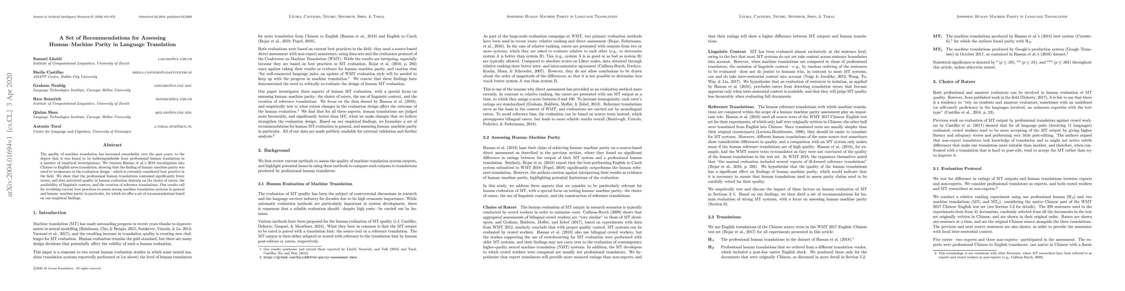 The quality of machine translation has increased remarkably over the past years, to the degree that it was found to be indistinguishable from professional human translation in a number of empirical investigations. We reassess Hassan et al.'s 2018 investigation into Chinese to English news translation, showing that the finding of human-machine parity was owed to weaknesses in the evaluation design - which is currently considered best practice in the field. We show that the professional human translations contained significantly fewer errors, and that perceived quality in human evaluation depends on the choice of raters, the availability of linguistic context, and the creation of reference translations. Our results call for revisiting current best practices to assess strong machine translation systems in general and human-machine parity in particular, for which we offer a set of recommendations based on our empirical findings.