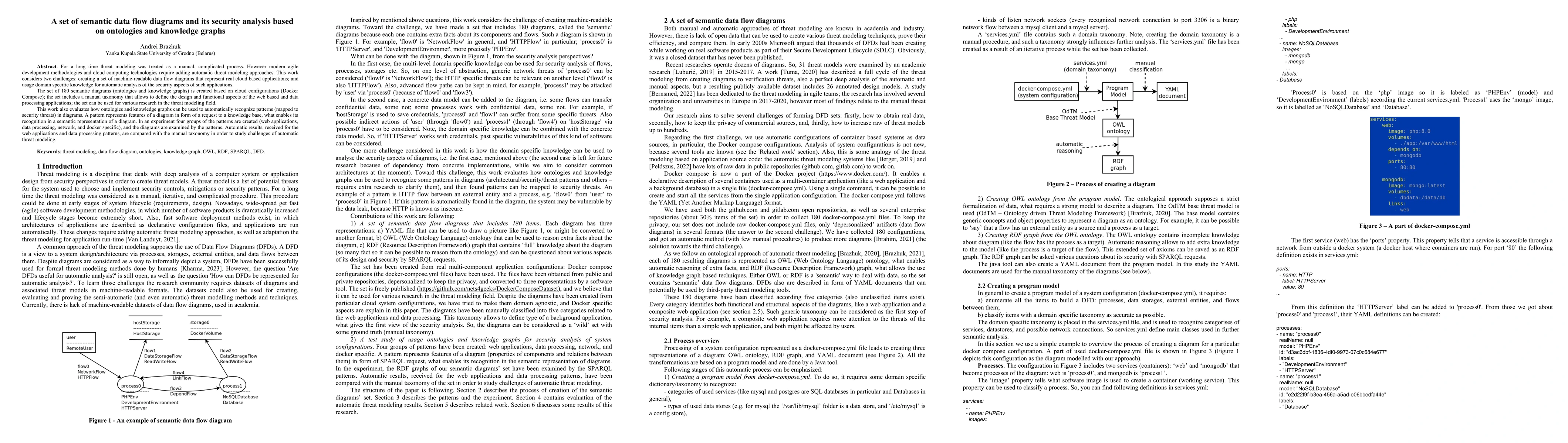 For a long time threat modeling was treated as a manual, complicated process. However modern agile development methodologies and cloud computing technologies require adding automatic threat modeling approaches. This work considers two challenges: creating a set of machine-readable data flow diagrams that represent real cloud based applications; and usage domain specific knowledge for automatic analysis of the security aspects of such applications. The set of 180 semantic diagrams (ontologies and knowledge graphs) is created based on cloud configurations (Docker Compose); the set includes a manual taxonomy that allows to define the design and functional aspects of the web based and data processing applications; the set can be used for various research in the threat modeling field. This work also evaluates how ontologies and knowledge graphs can be used to automatically recognize patterns (mapped to security threats) in diagrams. A pattern represents features of a diagram in form of a request to a knowledge base, what enables its recognition in a semantic representation of a diagram. In an experiment four groups of the patterns are created (web applications, data processing, network, and docker specific), and the diagrams are examined by the patterns. Automatic results, received for the web applications and data processing patterns, are compared with the manual taxonomy in order to study challenges of automatic threat modeling.