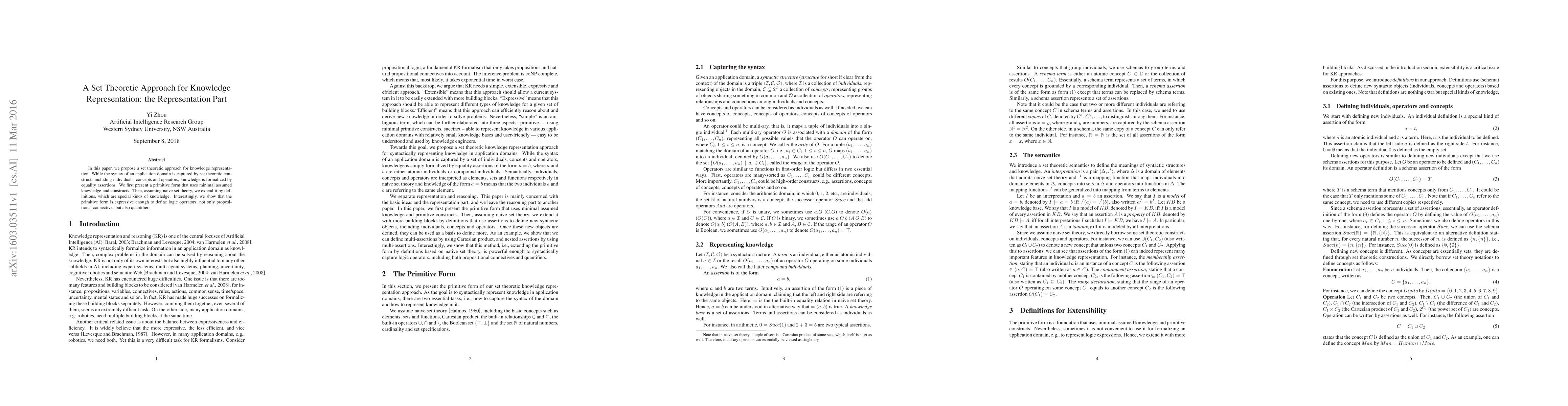 This paper proposes a set theoretic approach for knowledge representation using minimal constructs and equality assertions. It extends the primitive form with definitions and demonstrates its expressiveness in defining logic operators, including quantifiers.
