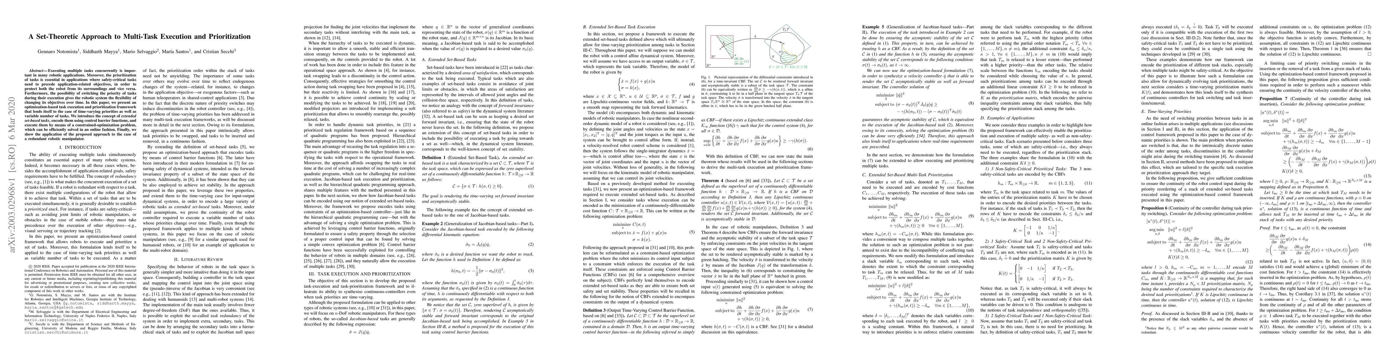 This paper presents an optimization-based framework for multi-task execution and prioritization in robotics, utilizing extended set-based tasks and control barrier functions. The approach allows for dynamic priority adjustments and efficient online optimization, demonstrated through a redundant robotic manipulator.