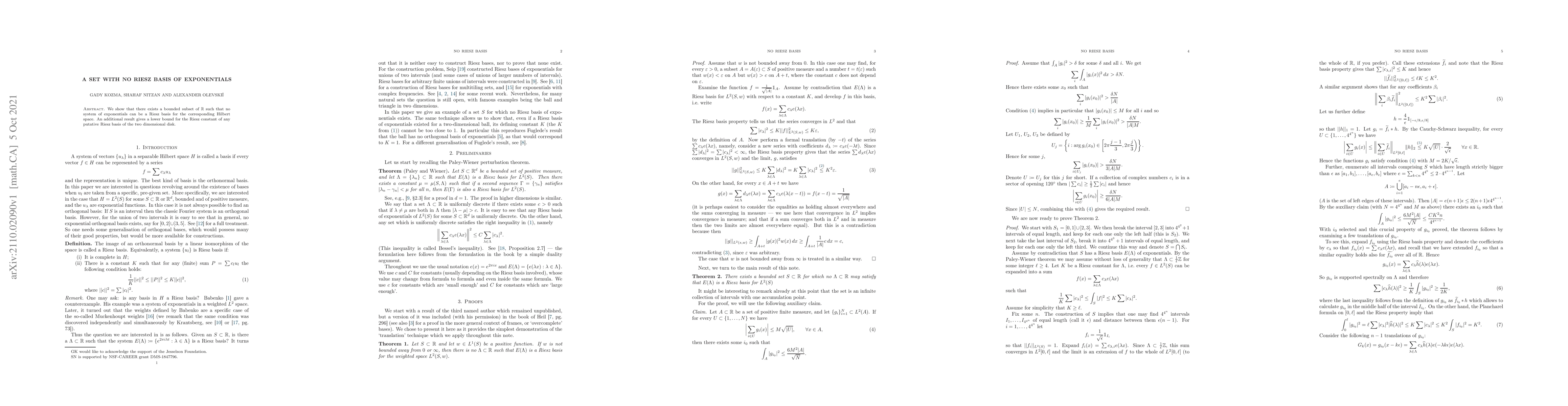 We show that there exists a bounded subset of R such that no system of exponentials can be a Riesz basis for the corresponding Hilbert space. An additional result gives a lower bound for the Riesz constant of any putative Riesz basis of the two dimensional disk.