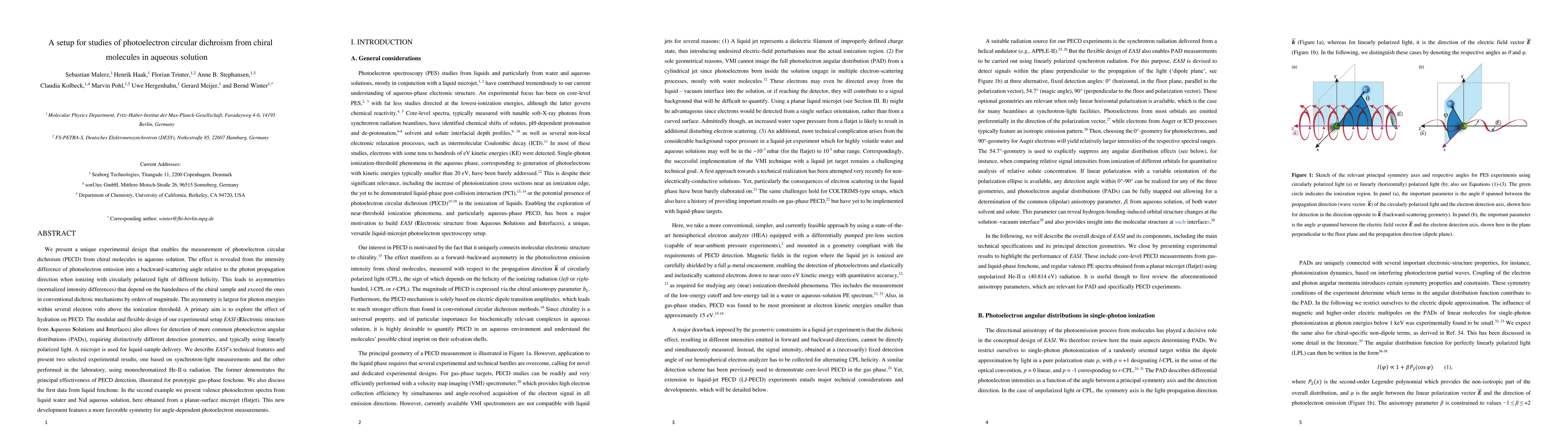 This paper introduces an innovative experimental setup, EASI, for measuring photoelectron circular dichroism (PECD) from chiral molecules in aqueous solution, revealing significant asymmetries in photoelectron emission. The design facilitates the study of hydration effects on PECD, and includes a microjet for liquid sample delivery, demonstrating its effectiveness with gas-phase and liquid fenchone, and water and NaI aqueous solutions.
