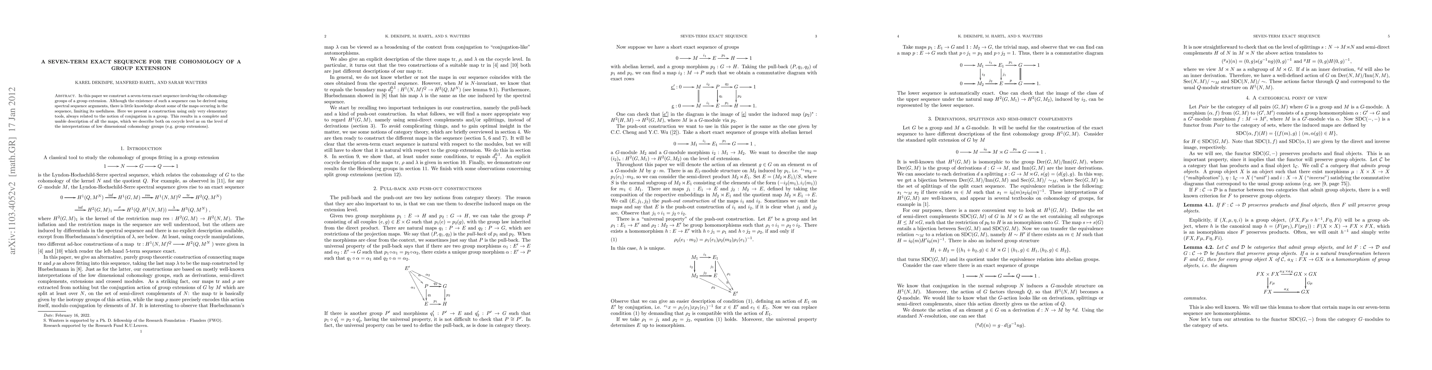 This paper constructs a seven-term exact sequence for the cohomology of a group extension using elementary tools related to conjugation. It provides a complete and usable description of all maps involved, enhancing understanding on both cocycle and low-dimensional cohomology group levels.