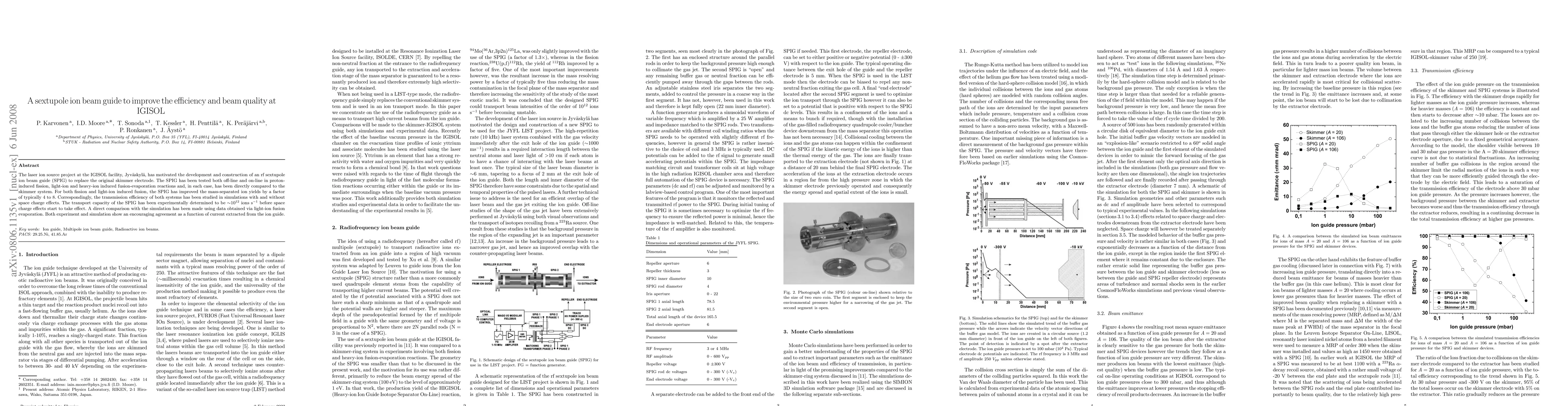The laser ion source project at the IGISOL facility, Jyvaskyla, has motivated the development and construction of an rf sextupole ion beam guide (SPIG) to replace the original skimmer electrode. The SPIG has been tested both off-line and on-line in proton-induced fission, light-ion and heavy-ion induced fusion-evaporation reactions and, in each case, has been directly compared to the skimmer system. For both fission and light-ion induced fusion, the SPIG has improved the mass-separated ion yields by a factor of typically 4 to 8. Correspondingly, the transmission efficiency of both systems has been studied in simulations with and without space charge effects. The transport capacity of the SPIG has been experimentally determined to be 10^12 ions/s before space charge effects start to take effect. A direct comparison with the simulation has been made using data obtained via light-ion fusion evaporation. Both experiment and simulation show an encouraging agreement as a function of current extracted from the ion guide.