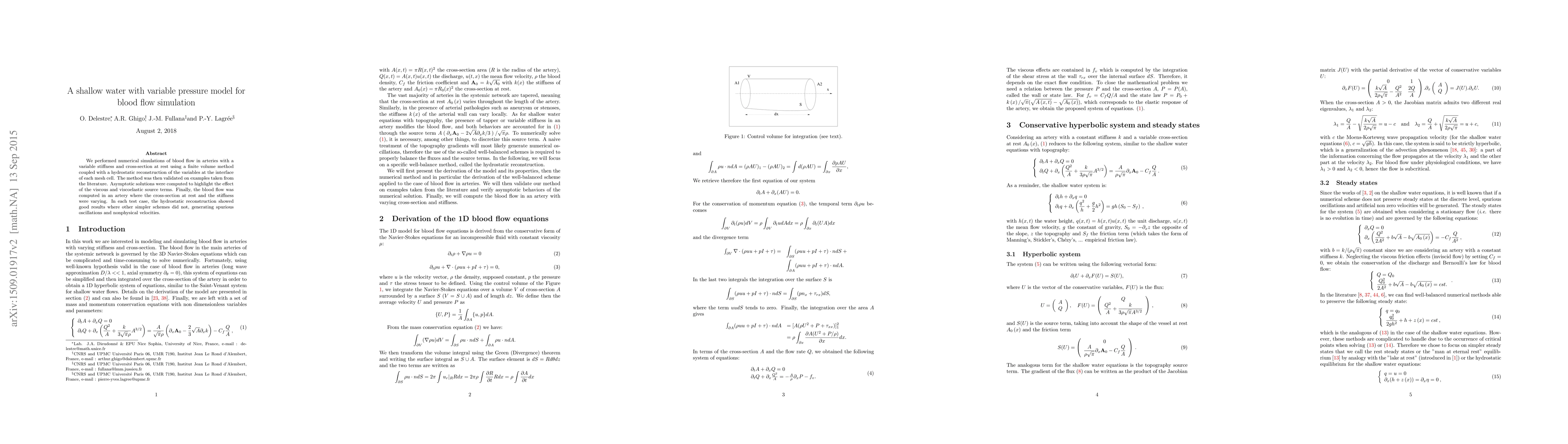 This paper presents a numerical simulation model for blood flow in arteries using a finite volume method with hydrostatic reconstruction, showing superior results compared to simpler schemes by avoiding spurious oscillations and nonphysical velocities. The model is validated and tested on arteries with varying stiffness and cross-section.
