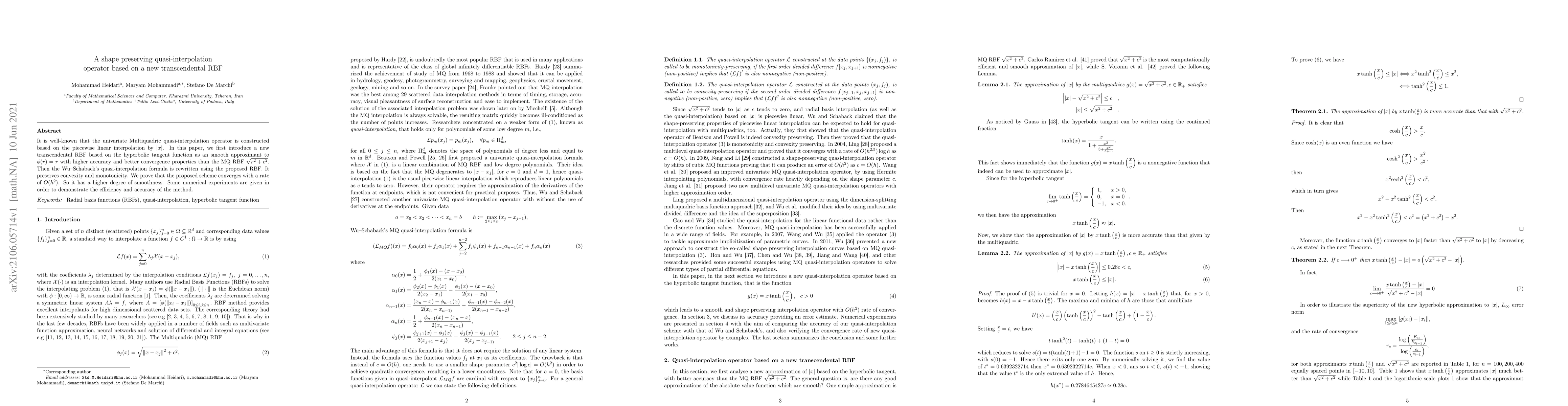 It is well-known that the univariate Multiquadric quasi-interpolation operator is constructed based on the piecewise linear interpolation by |x|. In this paper, we first introduce a new transcendental RBF based on the hyperbolic tangent function as a smooth approximant to f(r)=r with higher accuracy and better convergence properties than the multiquadric. Then Wu-Schaback's quasi-interpolation formula is rewritten using the proposed RBF. It preserves convexity and monotonicity. We prove that the proposed scheme converges with a rate of O(h^2). So it has a higher degree of smoothness. Some numerical experiments are given in order to demonstrate the efficiency and accuracy of the method.