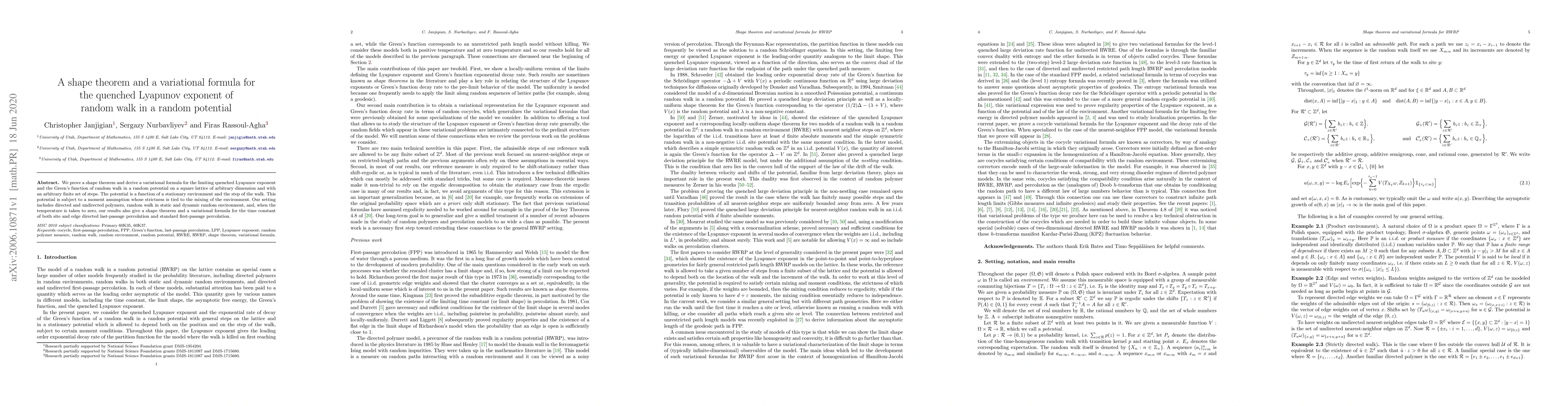 We prove a shape theorem and derive a variational formula for the limiting quenched Lyapunov exponent and the Green's function of random walk in a random potential on a square lattice of arbitrary dimension and with an arbitrary finite set of steps. The potential is a function of a stationary environment and the step of the walk. This potential is subject to a moment assumption whose strictness is tied to the mixing of the environment. Our setting includes directed and undirected polymers, random walk in static and dynamic random environment, and, when the temperature is taken to zero, our results also give a shape theorem and a variational formula for the time constant of both site and edge directed last-passage percolation and standard first-passage percolation.