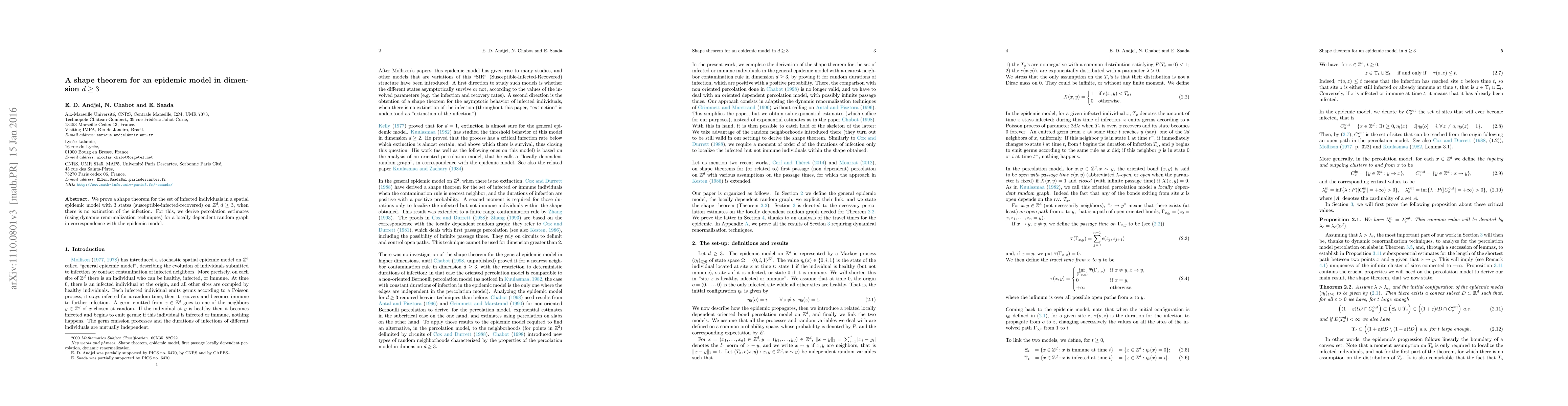 We prove a shape theorem for the set of infected individuals in a spatial epidemic model with 3 states (susceptible-infected-recovered) on ${\mathbb Z}^d,d\ge 3$, when there is no extinction of the infection. For this, we derive percolation estimates (using dynamic renormalization techniques) for a locally dependent random graph in correspondence with the epidemic model.