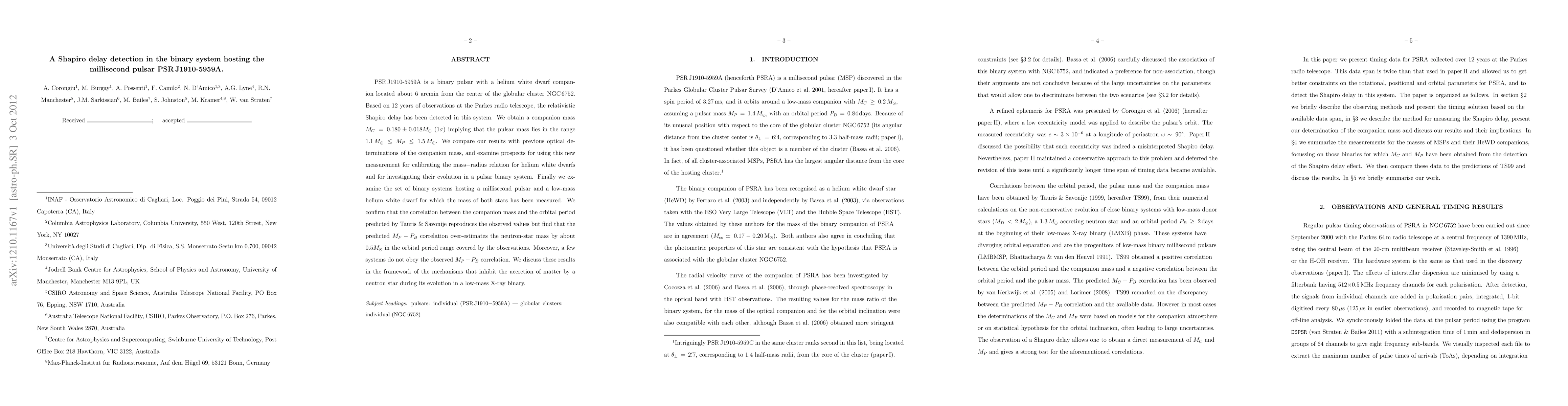 PSR J1910-5959A is a binary pulsar with a helium white dwarf companion located about 6 arcmin from the center of the globular cluster NGC6752. Based on 12 years of observations at the Parkes radio telescope, the relativistic Shapiro delay has been detected in this system. We obtain a companion mass Mc = 0.180+/-0.018Msun (1sigma) implying that the pulsar mass lies in the range 1.1Msun <= Mp <= 1.5Msun. We compare our results with previous optical determinations of the companion mass, and examine prospects for using this new measurement for calibrating the mass-radius relation for helium white dwarfs and for investigating their evolution in a pulsar binary system. Finally we examine the set of binary systems hosting a millisecond pulsar and a low mass helium white dwarf for which the mass of both stars has been measured. We confirm that the correlation between the companion mass and the orbital period predicted by Tauris & Savonije reproduces the observed values but find that the predicted Mp - Pb correlation over-estimates the neutron star mass by about 0.5Msun in the orbital period range covered by the observations. Moreover, a few systems do not obey the observed Mp - Pb correlation. We discuss these results in the framework of the mechanisms that inhibit the accretion of matter by a neutron star during its evolution in a low-mass X-ray binary.