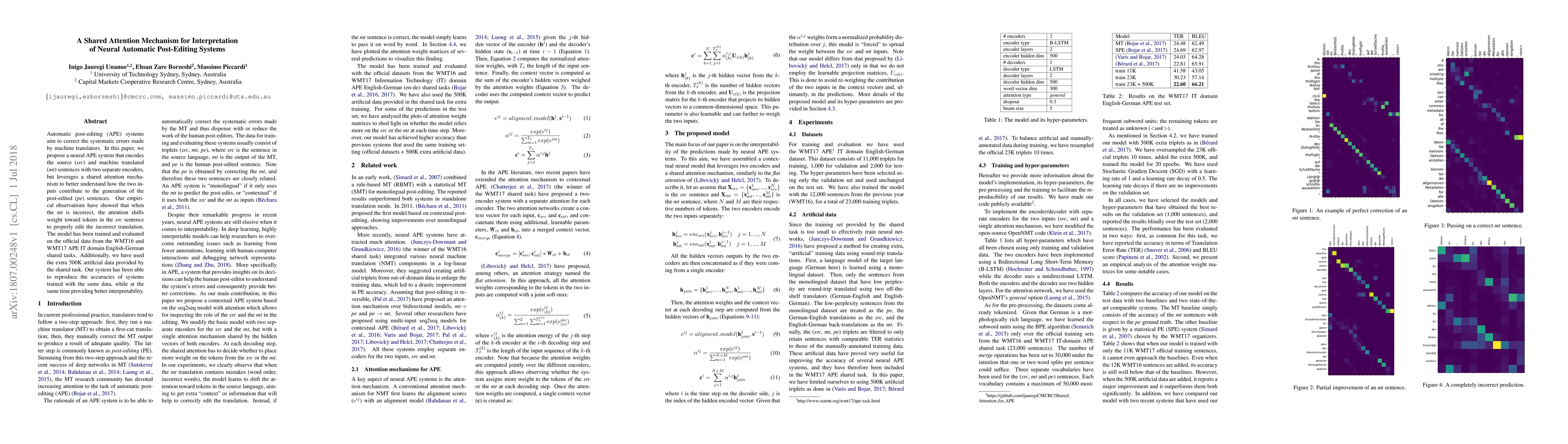 This paper proposes a neural automatic post-editing system using a shared attention mechanism to correct machine translation errors by comparing source and translated sentences. The model demonstrates improved interpretability and performance on WMT16 and WMT17 APE IT domain datasets.