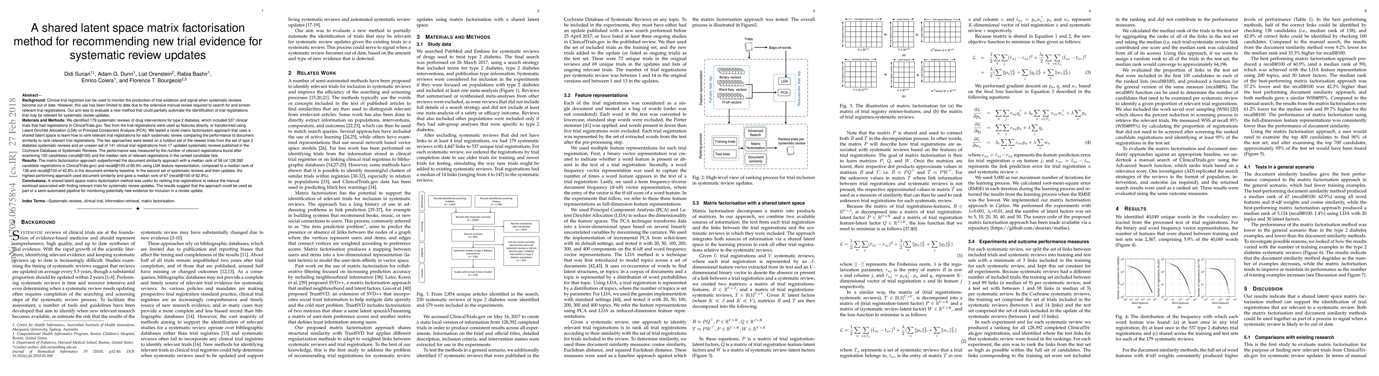 This paper proposes a matrix factorisation method to automate the identification of relevant clinical trial registrations for updating systematic reviews. The method outperformed a document similarity baseline in ranking new trials, suggesting its potential to reduce manual review efforts in systematic review updates.