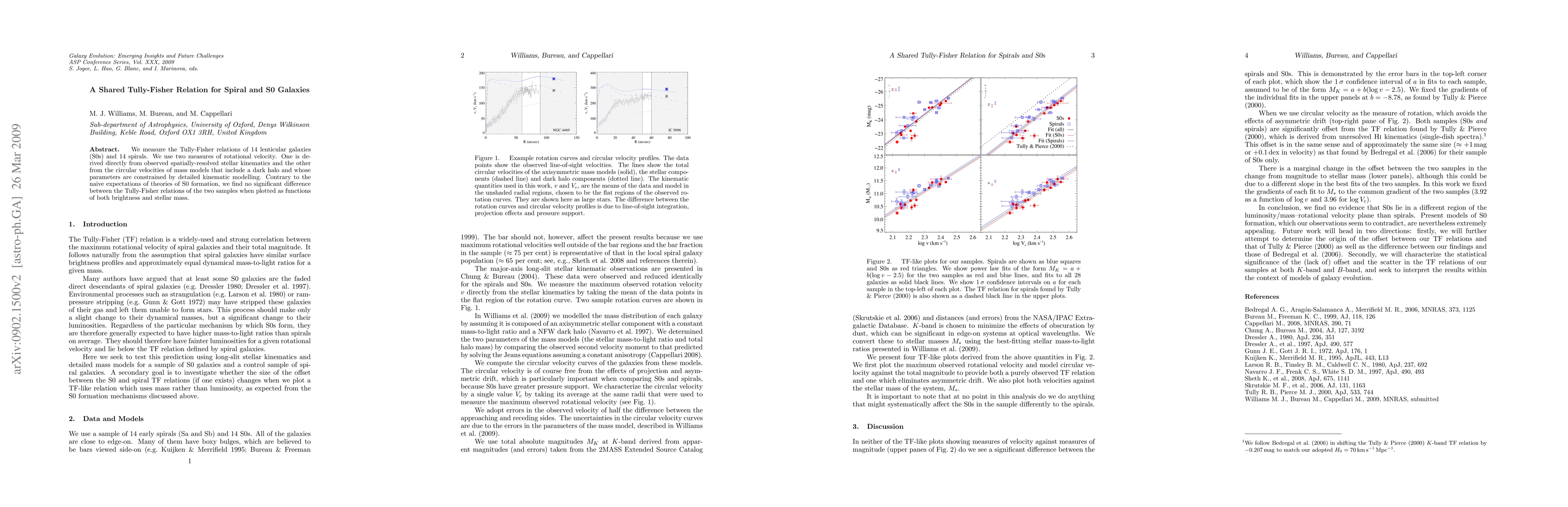 The authors measured the Tully-Fisher relations of 14 lenticular galaxies (S0s) and 14 spirals using two measures of rotational velocity.