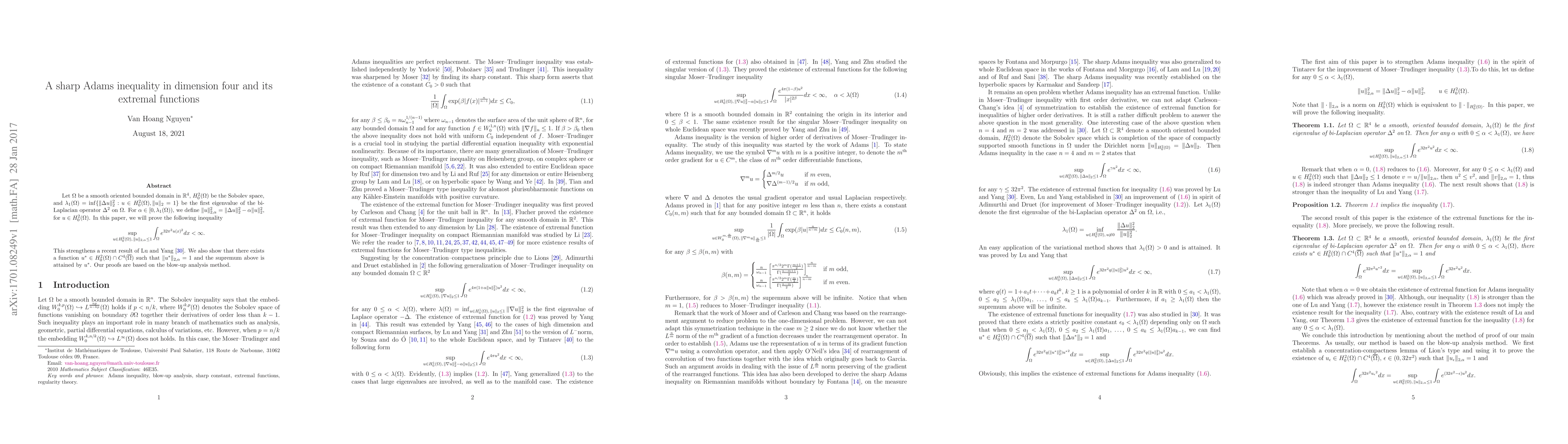 Let $\Omega$ be a smooth oriented bounded domain in $\mathbb R^4$, $H_0^2(\Omega)$ be the Sobolev space, and $\lambda_1(\Omega)= \inf \{\|\Delta u\|_2^2 : u\in H_0^2(\Omega), \|u\|_2 =1\}$ be the first eigenvalue of the bi-Laplacian operator $\Delta^2$ on $\Omega$. For $\alpha \in [0,\lambda_1(\Omega))$, we define $\|u\|_{2,\alpha}^2 = \|\Delta u\|_2^2 - \alpha \|u\|_2^2$, for $u \in H_0^2(\Omega)$. In this paper, we will prove the following inequality \[ \sup_{u\in H_0^2(\Omega),\, \|u\|_{2,\alpha} \leq 1} \int_{\Omega} e^{32 \pi^2 u(x)^2} dx < \infty. \] This strengthens a recent result of Lu and Yang \cite{LuYang}. We also show that there exists a function $u^*\in H_0^2(\Omega)\cap C^4(\overline{\Omega})$ such that $\|u^*\|_{2,\alpha} =1$ and the supremum above is attained by $u^*$. Our proofs are based on the blow-up analysis method.