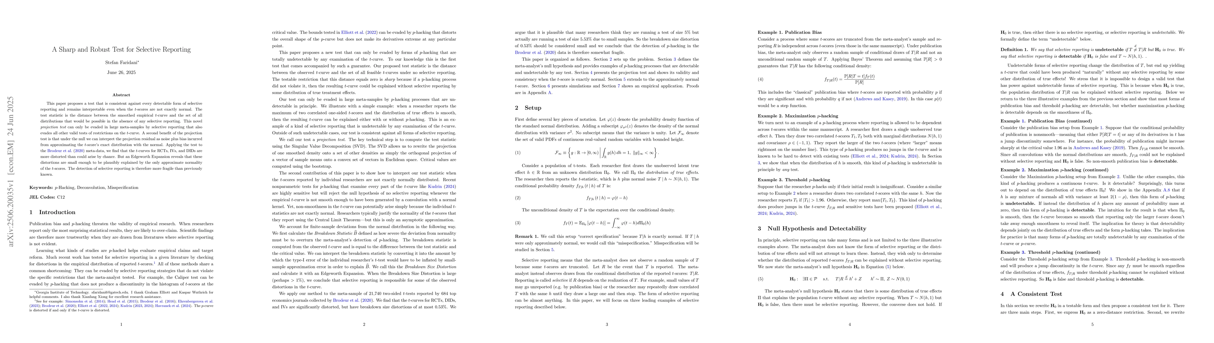 This paper proposes a test that is consistent against every detectable form of selective reporting and remains interpretable even when the t-scores are not exactly normal. The test statistic is the distance between the smoothed empirical t-curve and the set of all t-curves that would be possible in the absence of any selective reporting. This novel projection test can only be evaded in large meta-samples by selective reporting that also evades all other valid tests of restrictions on the t-curve. A second benefit of the projection test is that under the null we can interpret the projection residual as noise plus bias incurred from approximating the t-score's exact distribution with the normal. Applying the test to the Brodeur et al. (2020) meta-data, we find that the t-curves for RCTs, IVs, and DIDs are more distorted than could arise by chance. But an Edgeworth Expansion reveals that these distortions are small enough to be plausibly explained by the only approximate normality of the individual t-scores. The detection of selective reporting in this meta-sample is therefore more fragile than previously known.