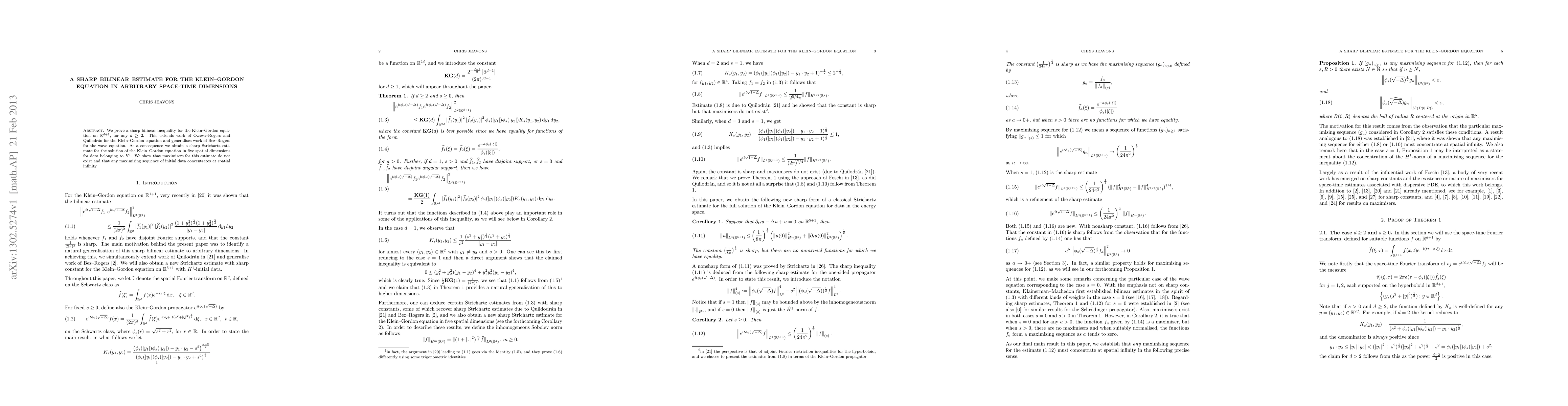 This paper proves a sharp bilinear inequality for the Klein-Gordon equation in arbitrary dimensions, extending previous results and generalizing findings for the wave equation. It also derives a sharp Strichartz estimate for the Klein-Gordon equation in five spatial dimensions, showing that no maximisers exist and that any maximising sequence of initial data concentrates at spatial infinity.