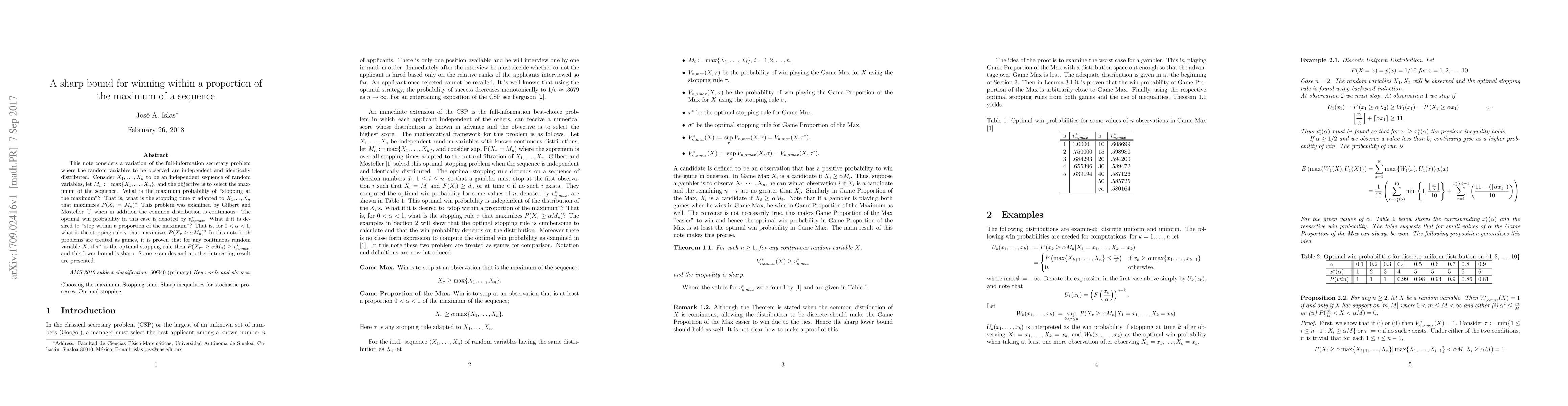 This note considers a variation of the full-information secretary problem where the random variables to be observed are independent and identically distributed. Consider $X_1,\dots,X_n$ to be an independent sequence of random variables, let $M_n:=\max\{X_1,\dots,X_n\}$, and the objective is to select the maximum of the sequence. What is the maximum probability of "stopping at the maximum"? That is, what is the stopping time $\tau$ adapted to $X_1,...,X_n$ that maximizes $P(X_{\tau}=M_n)$? This problem was examined by Gilbert and Mosteller \cite{GilMost} when in addition the common distribution is continuous. The optimal win probability in this case is denoted by $v_{n,max}^*$. What if it is desired to "stop within a proportion of the maximum"? That is, for $0<\alpha<1$, what is the stopping rule $\tau$ that maximizes $P(X_{\tau} \geq \alpha M_n)$? In this note both problems are treated as games, it is proven that for any continuous random variable $X$, if $\tau^*$ is the optimal stopping rule then $P(X_{\tau^*} \geq \alpha M_n)\geq v_{n,max}^*$, and this lower bound is sharp. Some examples and another interesting result are presented.