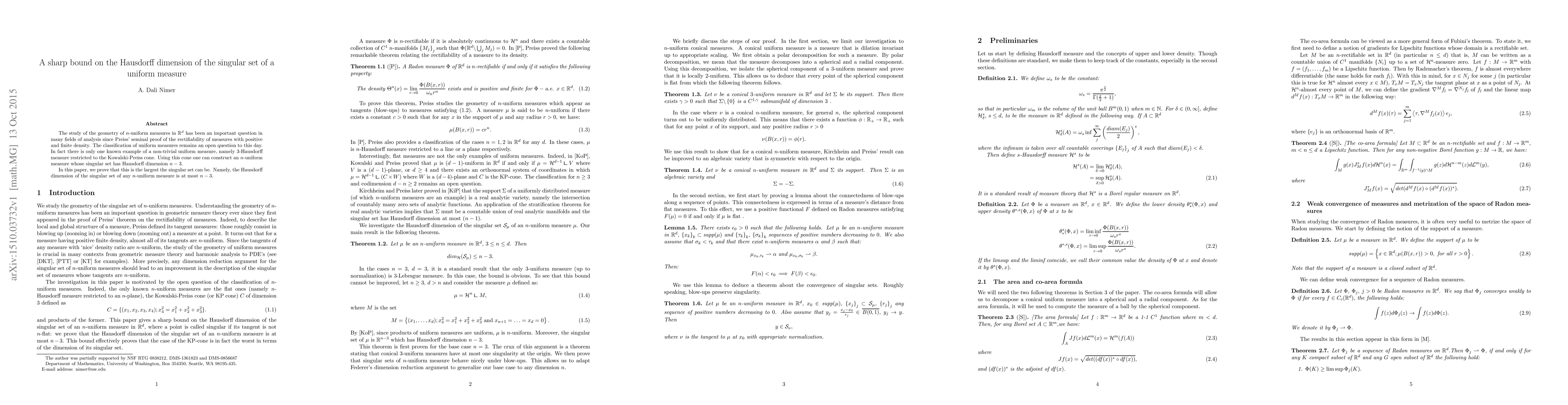 The study of the geometry of $n$-uniform measures in $\mathbb{R}^{d}$ has been an important question in many fields of analysis since Preiss' seminal proof of the rectifiability of measures with positive and finite density. The classification of uniform measures remains an open question to this day. In fact there is only one known example of a non-trivial uniform measure, namely $3$-Hausdorff measure restricted to the Kowalski-Preiss cone. Using this cone one can construct an $n$-uniform measure whose singular set has Hausdorff dimension $n-3$. In this paper, we prove that this is the largest the singular set can be. Namely, the Hausdorff dimension of the singular set of any $n$-uniform measure is at most $n-3$.