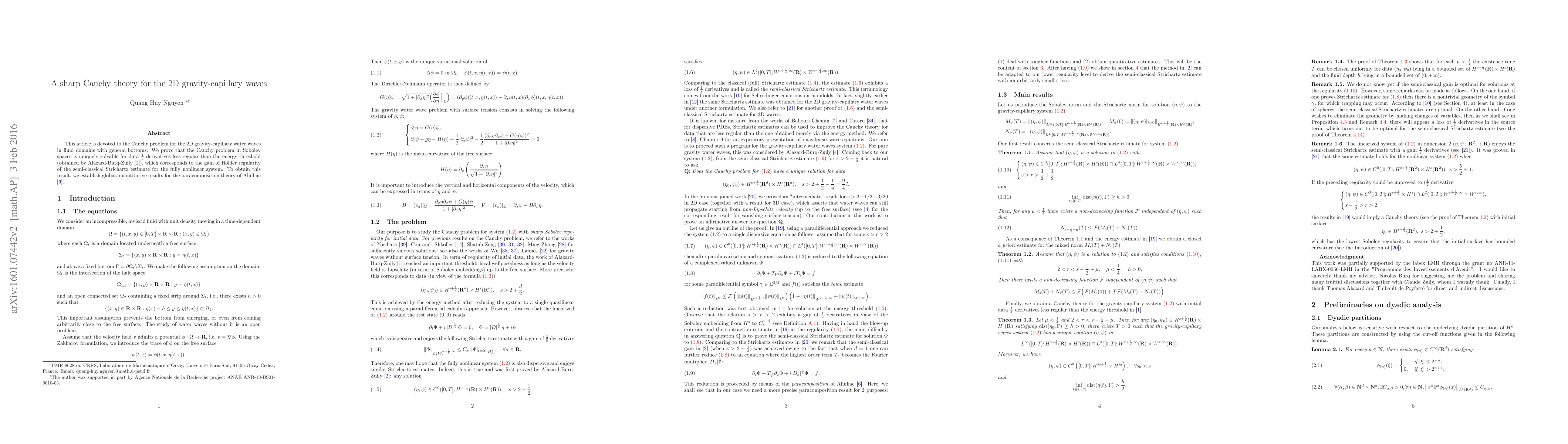 This paper addresses the Cauchy problem for 2D gravity-capillary water waves, proving unique solvability in Sobolev spaces for data less regular than the energy threshold. The result leverages global, quantitative paracomposition theory to achieve a gain in Hölder regularity.