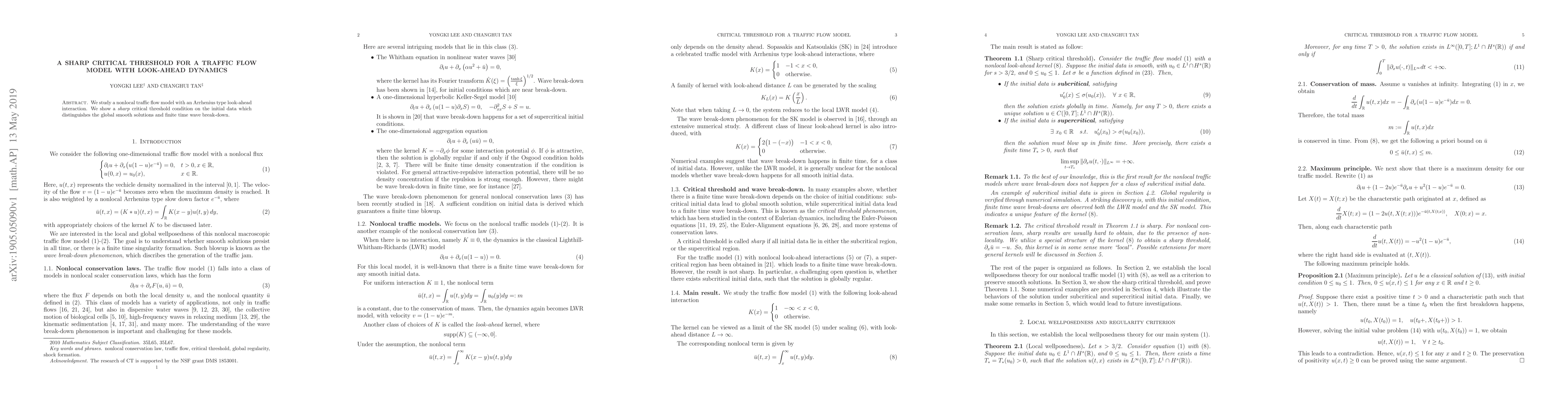 Summary: This paper investigates a nonlocal traffic flow model incorporating look-ahead dynamics, demonstrating a critical threshold in initial data that determines whether solutions remain smooth globally or experience finite time wave break-down.