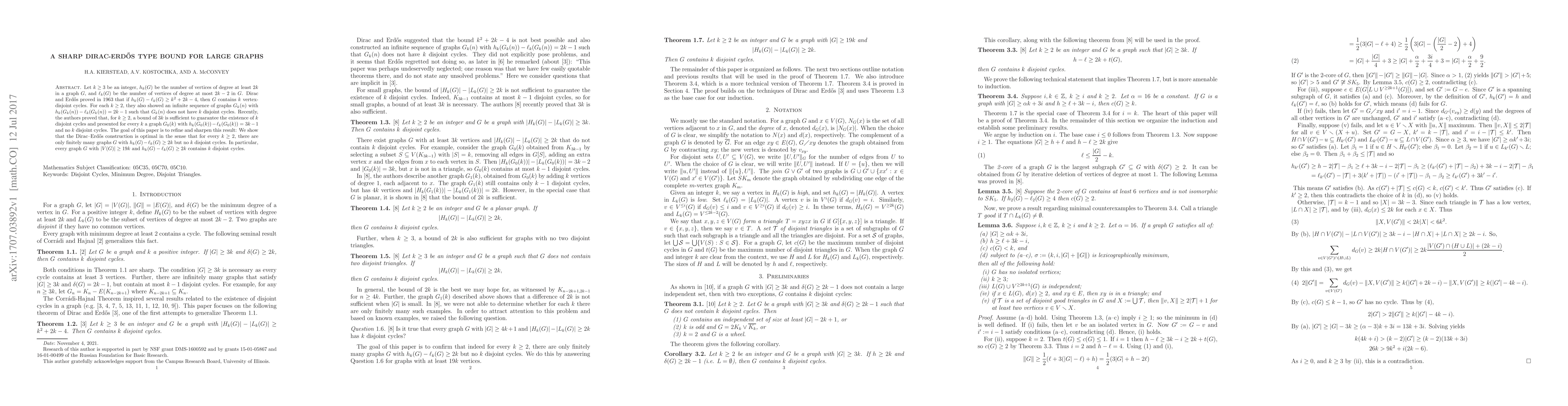 Let $k \geq 3$ be an integer, $h_{k}(G)$ be the number of vertices of degree at least $2k$ in a graph $G$, and $\ell_{k}(G)$ be the number of vertices of degree at most $2k-2$ in $G$. Dirac and Erd\H{o}s proved in 1963 that if $h_{k}(G) - \ell_{k}(G) \geq k^{2} + 2k - 4$, then $G$ contains $k$ vertex-disjoint cycles. For each $k\geq 2$, they also showed an infinite sequence of graphs $G_k(n)$ with $h_{k}(G_k(n)) - \ell_{k}(G_k(n)) = 2k-1$ such that $G_k(n)$ does not have $k$ disjoint cycles. Recently, the authors proved that, for $k \geq 2$, a bound of $3k$ is sufficient to guarantee the existence of $k$ disjoint cycles and presented for every $k$ a graph $G_0(k)$ with $h_{k}(G_0(k)) - \ell_{k}(G_0(k))=3k-1$ and no $k$ disjoint cycles. The goal of this paper is to refine and sharpen this result: We show that the Dirac-Erd\H{o}s construction is optimal in the sense that for every $k \geq 2$, there are only finitely many graphs $G$ with $h_{k}(G) - \ell_{k}(G) \geq 2k$ but no $k$ disjoint cycles. In particular, every graph $G$ with $|V(G)| \geq 19k$ and $h_{k}(G) - \ell_{k}(G) \geq 2k$ contains $k$ disjoint cycles.