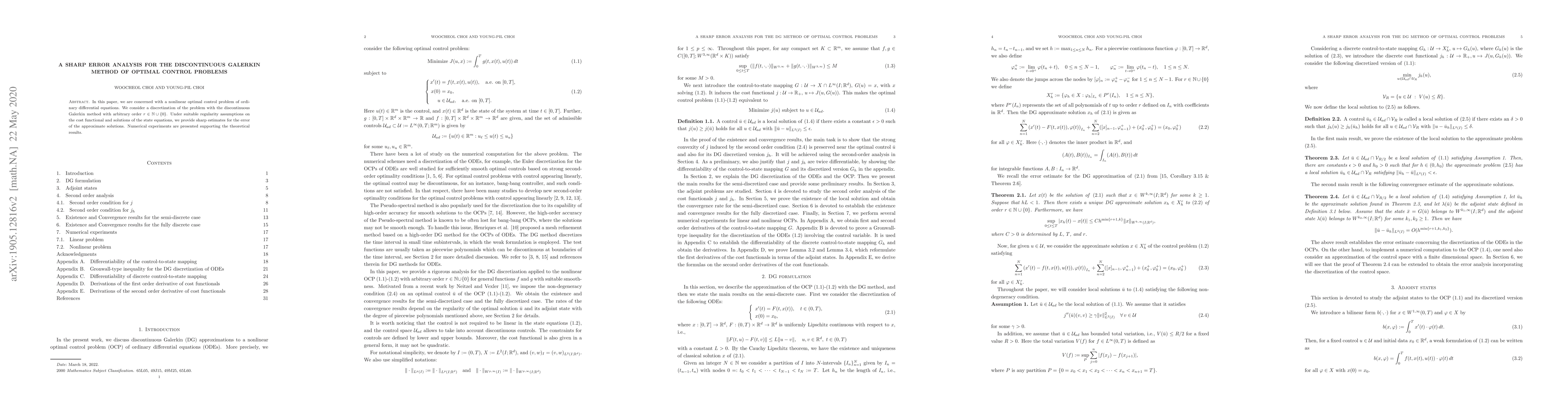 This paper analyzes the discontinuous Galerkin method for solving optimal control problems of ordinary differential equations, providing sharp error estimates under certain regularity conditions. Numerical experiments validate the theoretical findings.