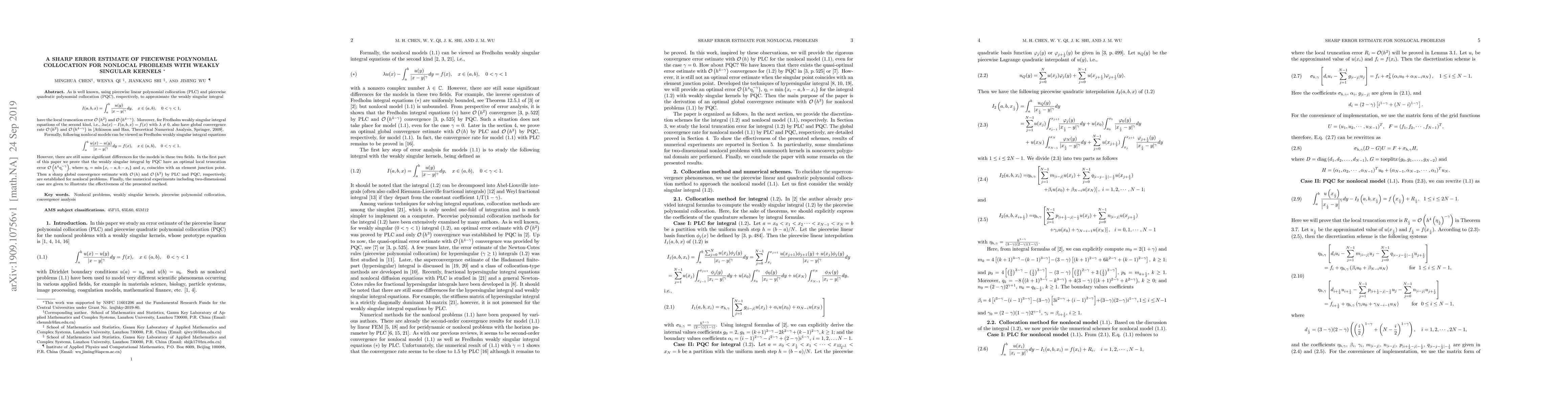 As is well known, using piecewise linear polynomial collocation (PLC) and piecewise quadratic polynomial collocation (PQC), respectively, to approximate the weakly singular integral $$I(a,b,x) =\int^b_a \frac{u(y)}{|x-y|^\gamma}dy, \quad x \in (a,b) ,\quad 0< \gamma <1,$$ have the local truncation error $\mathcal{O}\left(h^2\right)$ and $\mathcal{O}\left(h^{4-\gamma}\right)$. Moreover, for Fredholm weakly singular integral equations of the second kind, i.e., $\lambda u(x)- I(a,b,x) =f(x)$ with $ \lambda \neq 0$, also have global convergence rate $\mathcal{O}\left(h^2\right)$ and $\mathcal{O}\left(h^{4-\gamma}\right)$ in [Atkinson and Han, Theoretical Numerical Analysis, Springer, 2009]. Formally, following nonlocal models can be viewed as Fredholm weakly singular integral equations $$\int^b_a \frac{u(x)-u(y)}{|x-y|^\gamma}dy =f(x), \quad x \in (a,b) ,\quad 0< \gamma <1.$$ However, there are still some significant differences for the models in these two fields. In the first part of this paper we prove that the weakly singular integral by PQC have an optimal local truncation error $\mathcal{O}\left(h^4\eta_i^{-\gamma}\right)$, where $\eta_i=\min\left\{x_i-a,b-x_i\right\}$ and $x_i$ coincides with an element junction point. Then a sharp global convergence estimate with $\mathcal{O}\left(h\right)$ and $\mathcal{O}\left(h^3\right)$ by PLC and PQC, respectively, are established for nonlocal problems. Finally, the numerical experiments including two-dimensional case are given to illustrate the effectiveness of the presented method.