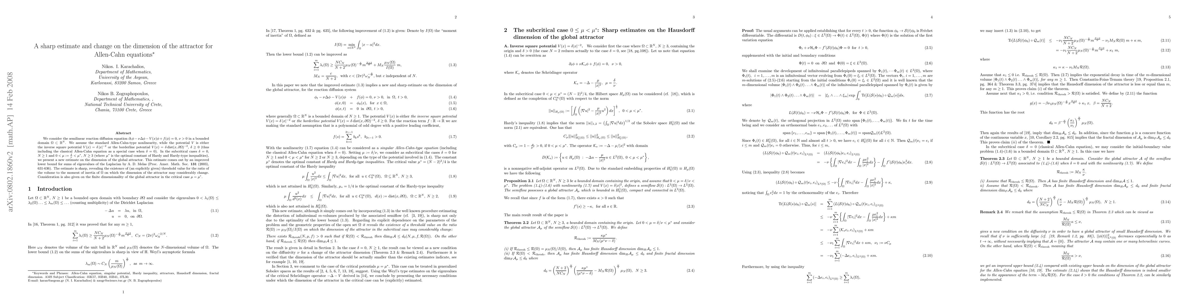 We consider the semilinear reaction diffusion equation $\partial_t\phi-\nu\Delta\phi-V(x)\phi+f(\phi)=0$, $\nu>0$ in a bounded domain $\Omega\subset\mathbb{R}^N$. We assume the standard Allen-Cahn-type nonlinearity, while the potential $V$ is either the inverse square potential $V(x)=\delta |x|^{-2}$ or the borderline potential $V(x)=\delta \mathrm{dist}(x,\partial\Omega)^{-2}$, $\delta\geq 0$ (thus including the classical Allen-Cahn equation as a special case when $\delta=0$). In the subcritical cases $\delta=0$, $N\geq 1$ and $0<\mu:=\frac{\delta}{\nu}<\mu^*$, $N\geq 3$ (where $\mu^*$ is the optimal constant of Hardy and Hardy-type inequalities), we present a new estimate on the dimension of the global attractor. This estimate comes out by an improved lower bound for sums of eigenvalues of the Laplacian by A. D. Melas (Proc. Amer. Math. Soc. \textbf{131} (2003), 631-636). The estimate is sharp, revealing the existence of (an explicitly given) threshold value for the ratio of the volume to the moment of inertia of $\Omega$ on which the dimension of the attractor may considerably change. Consideration is also given on the finite dimensionality of the global attractor in the critical case $\mu=\mu^*$.
