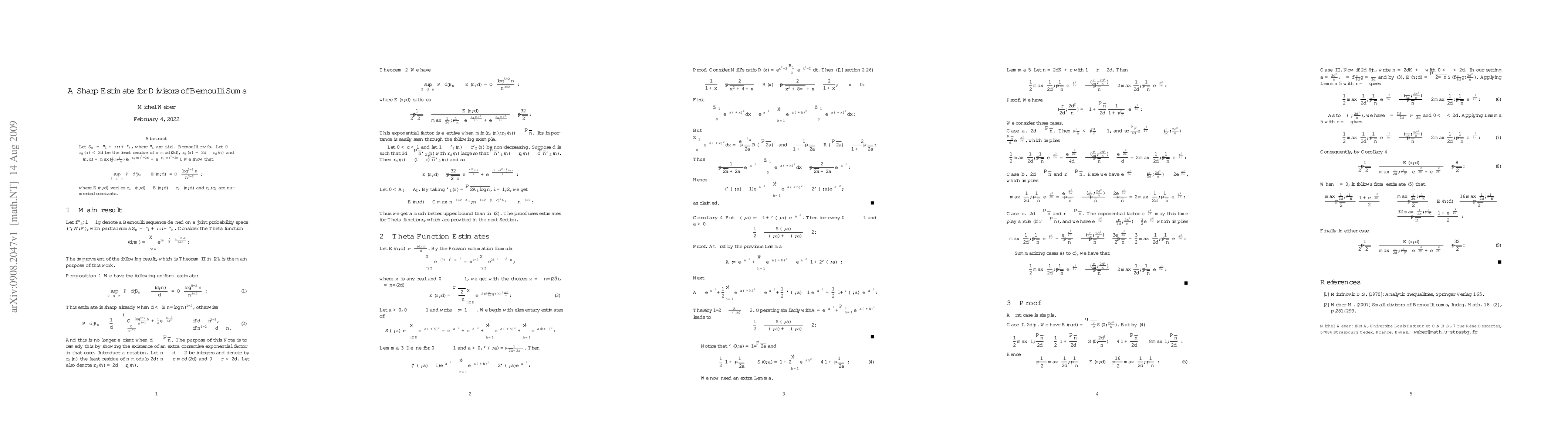 Let $S_n=\e_1+...+\e_n$, where $ \e_i $ are i.i.d. Bernoulli r.v.'s. Let $0\le r_d(n)<2d$ be the least residue of $n$ mod$(2d)$, $\bar r_d(n)= 2d -r_d(n)$ and $\b(n,d)=\max ({1\over d}, {1\over \sqrt n})[e^{- {r_d(n)^2/2 n}} +e^{- {\bar r_d(n)^2/2 n}}]$. We show that $$\sup_{2\le d\le n} \big|\P\big\{d|S_n\big\}- E(n,d) \big|= {\cal O}\big({\log^{5/2} n \over n^{3/2}}\big), $$ where $E(n,d) $ verifies $c_1\b(n,d)\le E(n,d)\le c_2\b(n,d) $ and $c_1,c_2 $ are numerical constants.