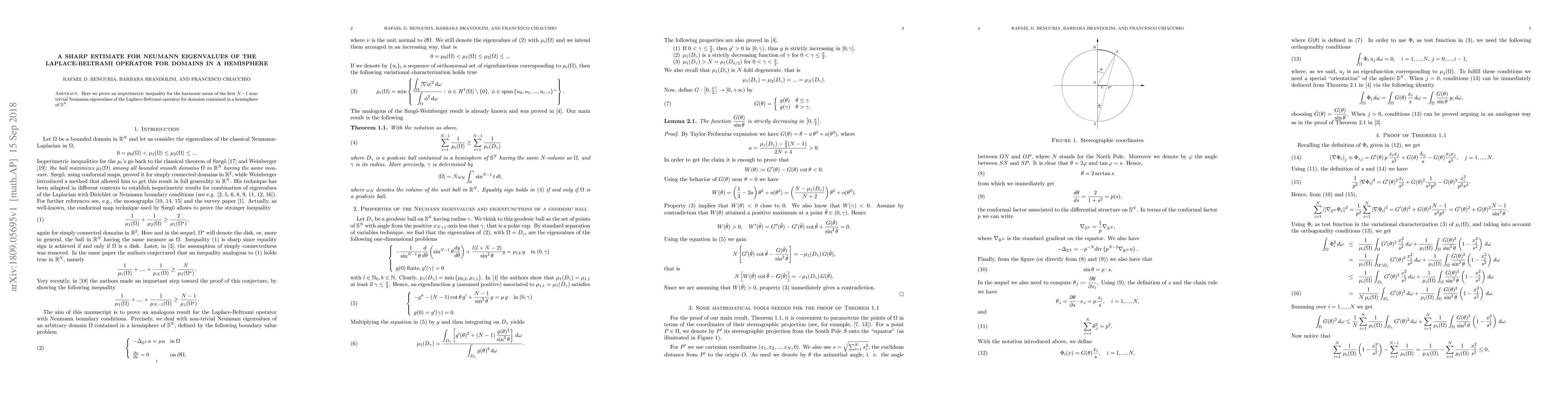 This paper establishes an isoperimetric inequality for the harmonic mean of the first $N-1$ non-trivial Neumann eigenvalues of the Laplace-Beltrami operator in domains within a hemisphere of $\mathbb{S}^N$. The result provides a sharp estimate for these eigenvalues.