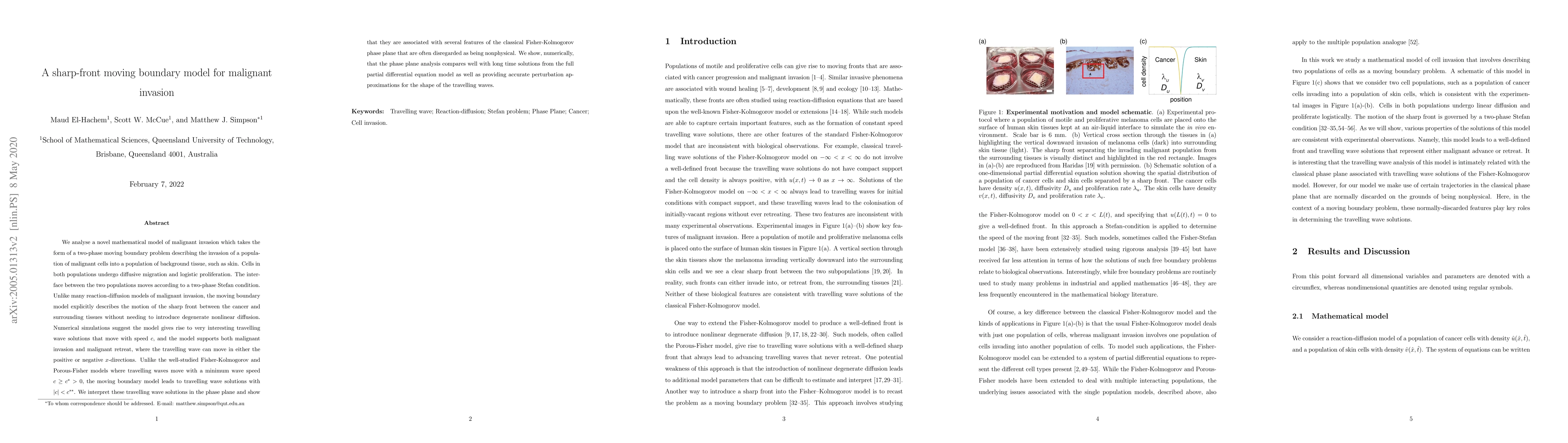 This paper introduces a novel mathematical model for malignant invasion as a sharp-front moving boundary problem, describing the invasion of malignant cells into background tissue. Unlike traditional models, it explicitly captures the sharp front without degenerate diffusion, and supports travelling wave solutions that can move in either direction.