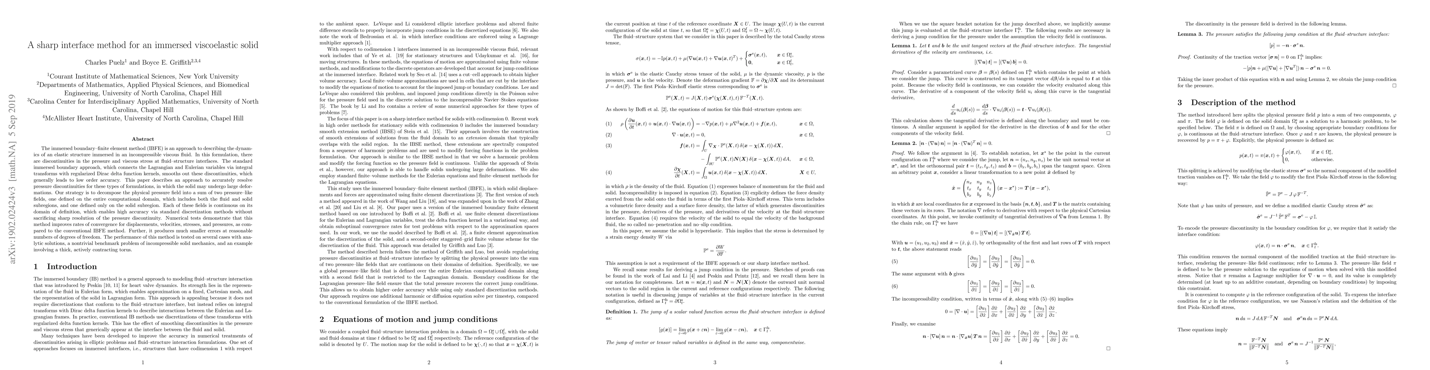 This paper presents an improved immersed boundary-finite element method for viscoelastic solids immersed in fluids, resolving pressure discontinuities more accurately. The method decomposes the pressure field into two continuous fields, enhancing accuracy without smoothing out interface discontinuities, leading to better convergence rates and smaller errors compared to conventional methods.