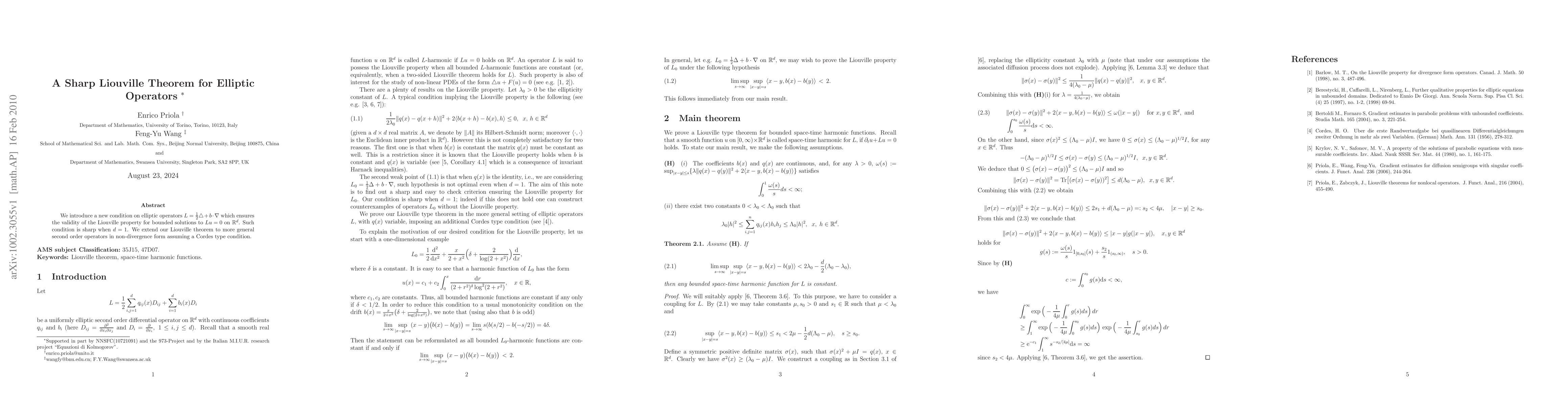 This paper establishes a sharp Liouville theorem for elliptic operators ensuring the Liouville property for bounded solutions to $Lu=0$ on $\R^d$, with a new condition that is optimal for $d=1$. The theorem is extended to more general second-order operators in non-divergence form under a Cordes type condition.