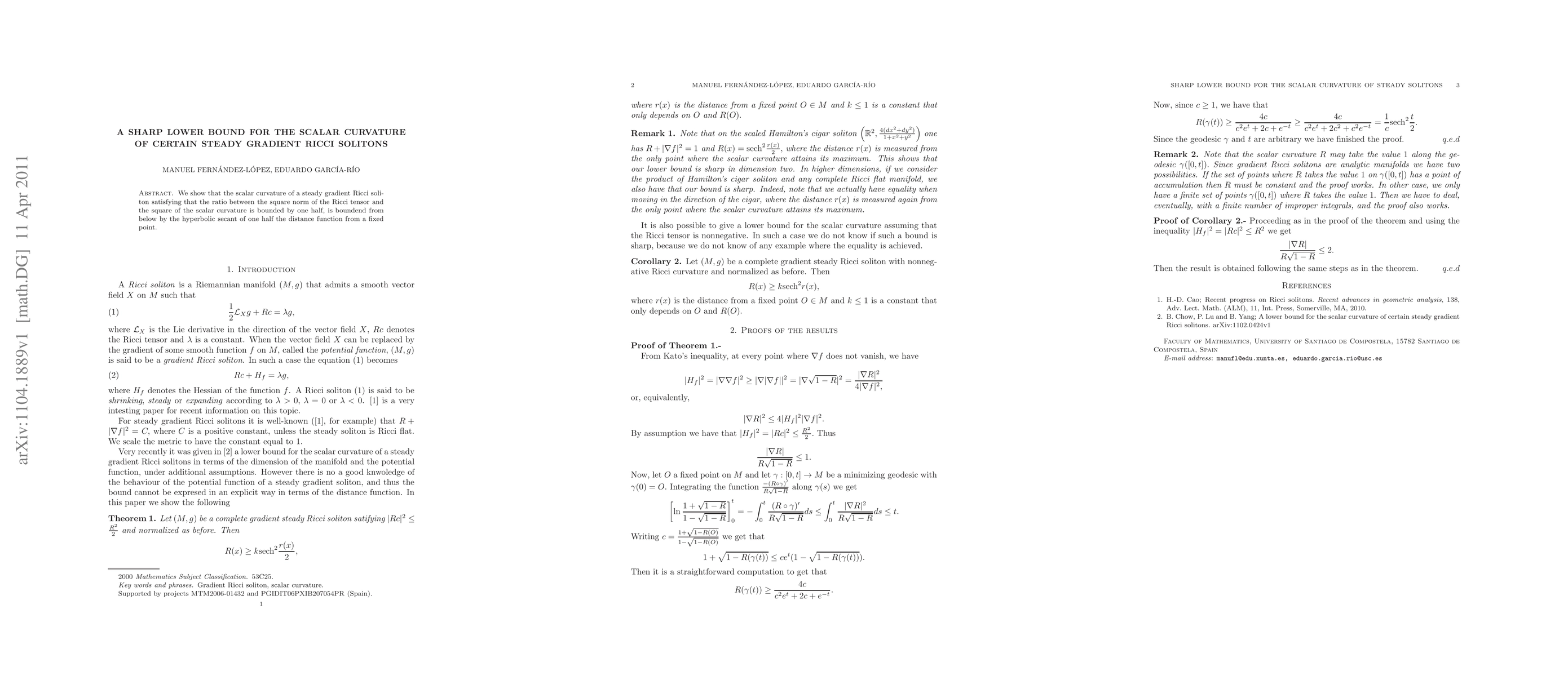 Summary: This paper establishes a sharp lower bound for the scalar curvature of steady gradient Ricci solitons where the ratio of the Ricci tensor norm to scalar curvature squared is ≤ 1/2, showing it is bounded below by the hyperbolic secant of half the distance from a fixed point.