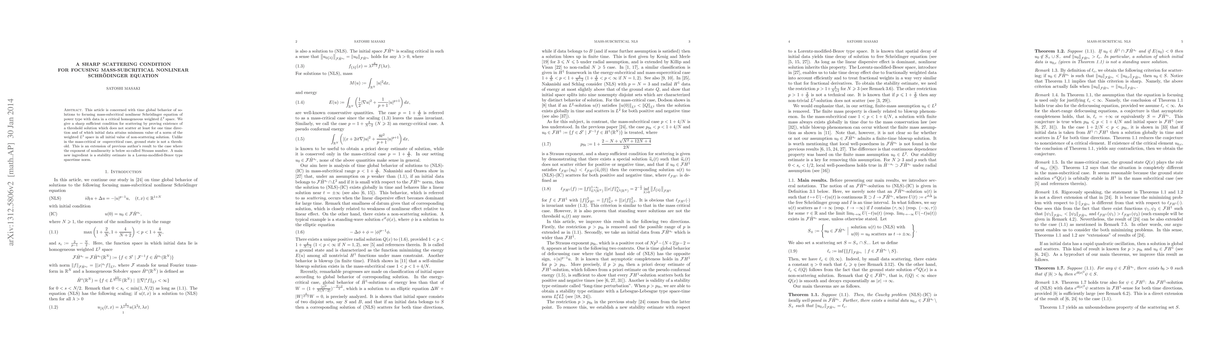 This paper establishes a sharp scattering condition for focusing mass-subcritical nonlinear Schrödinger equations, proving the existence of a threshold solution that does not scatter in at least one time direction. Unlike mass-critical or supercritical cases, the ground state does not serve as a threshold, extending previous results to subcritical exponents.