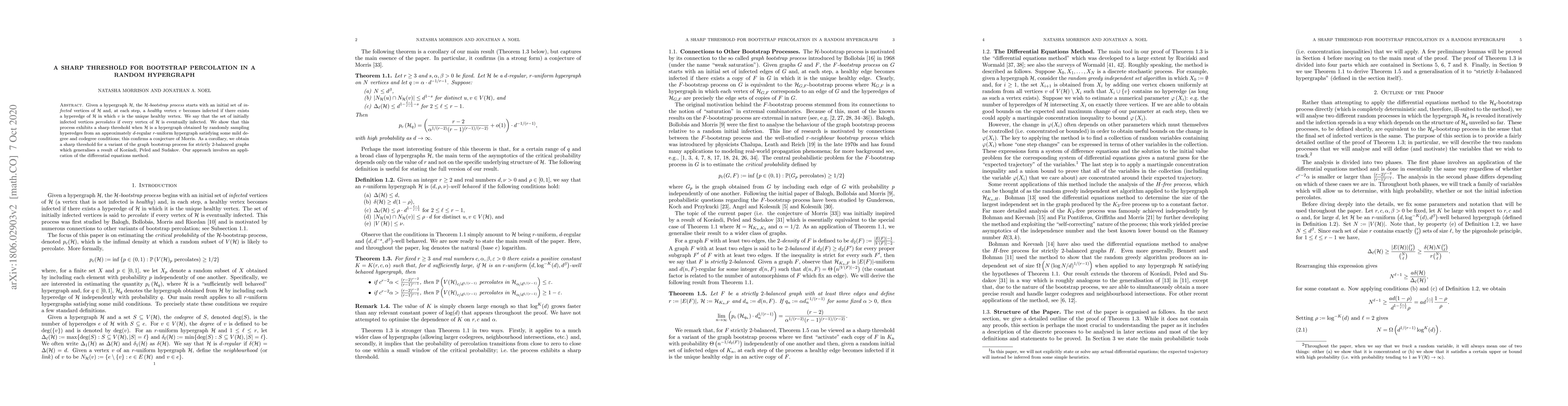 This paper demonstrates a sharp threshold for the $\mathcal{H}$-bootstrap percolation process in random hypergraphs, confirming a conjecture by Morris. It also extends the result to a variant of the graph bootstrap process for strictly $2$-balanced graphs using differential equations.