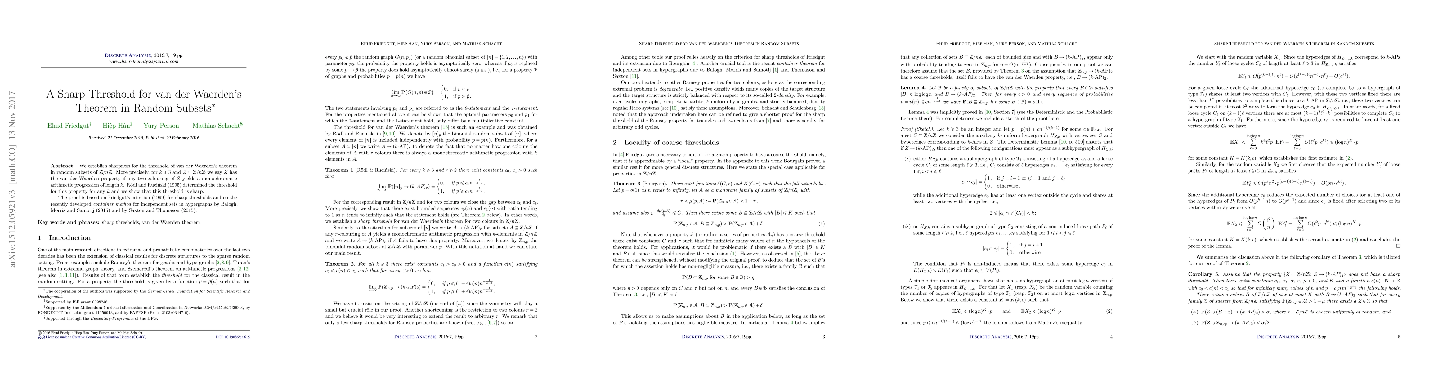 This paper establishes the sharpness of the threshold for van der Waerden's theorem in random subsets of $\mathbb{Z}/n\mathbb{Z}$, confirming that the threshold determined by Rödl and Ruciński (1995) is exact. The proof leverages Friedgut's criteria and the container method for independent sets in hypergraphs.