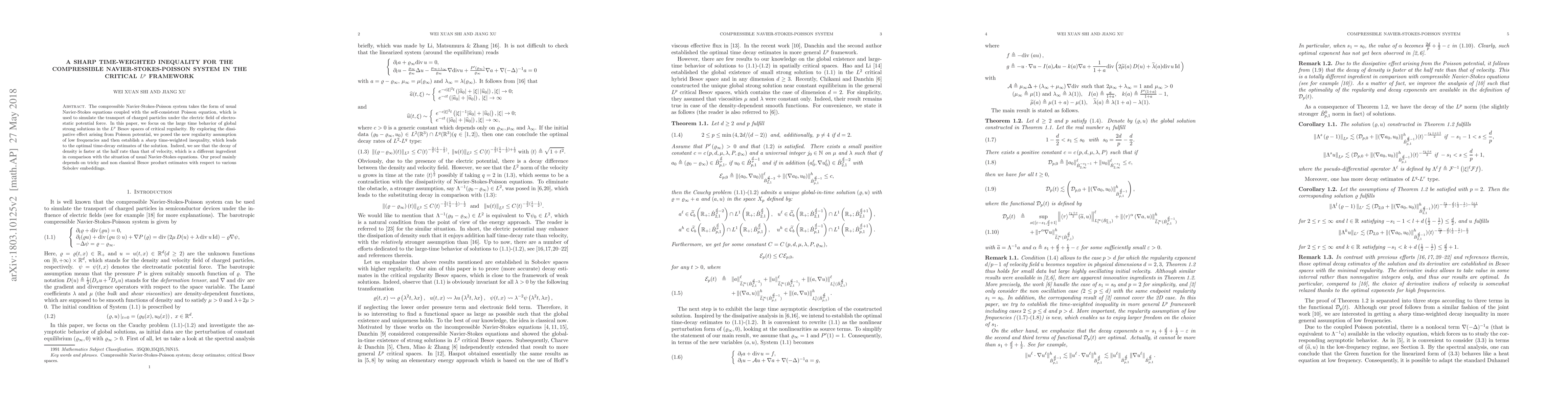 This paper establishes a sharp time-weighted inequality for the compressible Navier-Stokes-Poisson system, focusing on the large-time behavior of global strong solutions. It introduces a new regularity assumption and demonstrates that density decays faster than velocity, utilizing non-classical Besov product estimates.