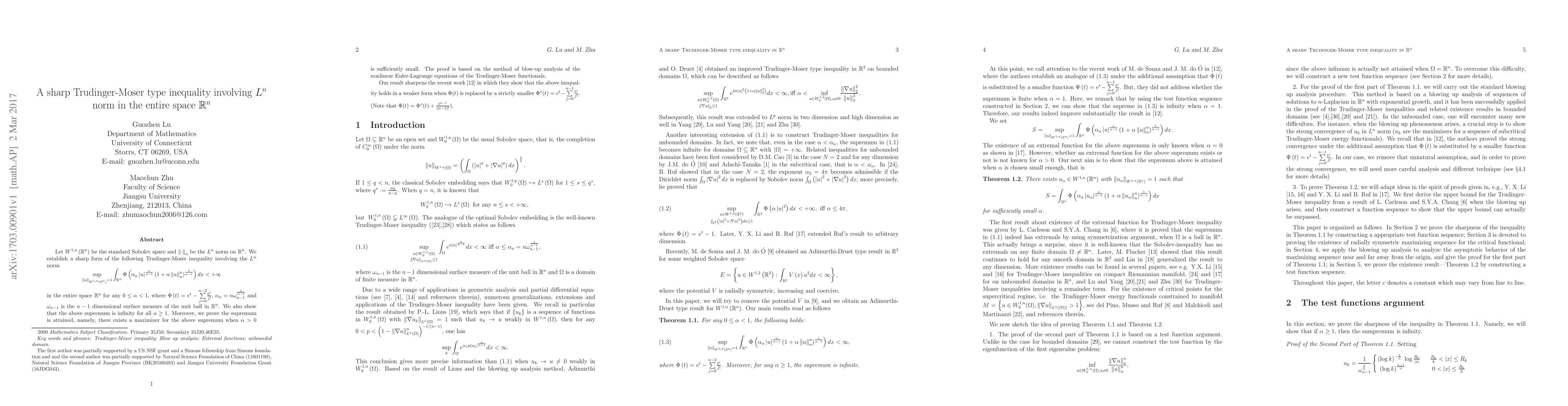 Let $W^{1,n} ( \mathbb{R}^{n} $ be the standard Sobolev space and $\left\Vert \cdot\right\Vert _{n}$ be the $L^{n}$ norm on $\mathbb{R}^n$. We establish a sharp form of the following Trudinger-Moser inequality involving the $L^{n}$ norm \[ \underset{\left\Vert u\right\Vert _{W^{1,n}\left(\mathbb{R} ^{n}\right) }=1}{\sup}\int_{ \mathbb{R}^{n}}\Phi\left( \alpha_{n}\left\vert u\right\vert ^{\frac{n}{n-1}}\left( 1+\alpha\left\Vert u\right\Vert _{n}^{n}\right) ^{\frac{1}{n-1}}\right) dx<+\infty \]in the entire space $\mathbb{R}^n$ for any $0\leq\alpha<1$, where $\Phi\left( t\right) =e^{t}-\underset{j=0}{\overset{n-2}{\sum}}% \frac{t^{j}}{j!}$, $\alpha_{n}=n\omega_{n-1}^{\frac{1}{n-1}}$ and $\omega_{n-1}$ is the $n-1$ dimensional surface measure of the unit ball in $\mathbb{R}^n$. We also show that the above supremum is infinity for all $\alpha\geq1$. Moreover, we prove the supremum is attained, namely, there exists a maximizer for the above supremum when $\alpha>0$ is sufficiently small. The proof is based on the method of blow-up analysis of the nonlinear Euler-Lagrange equations of the Trudinger-Moser functionals. Our result sharpens the recent work \cite{J. M. do1} in which they show that the above inequality holds in a weaker form when $\Phi(t)$ is replaced by a strictly smaller $\Phi^*(t)=e^{t}-\underset{j=0}{\overset{n-1}{\sum}}% \frac{t^{j}}{j!}$. (Note that $\Phi(t)=\Phi^*(t)+\frac{t^{n-1}}{(n-1)!}$).