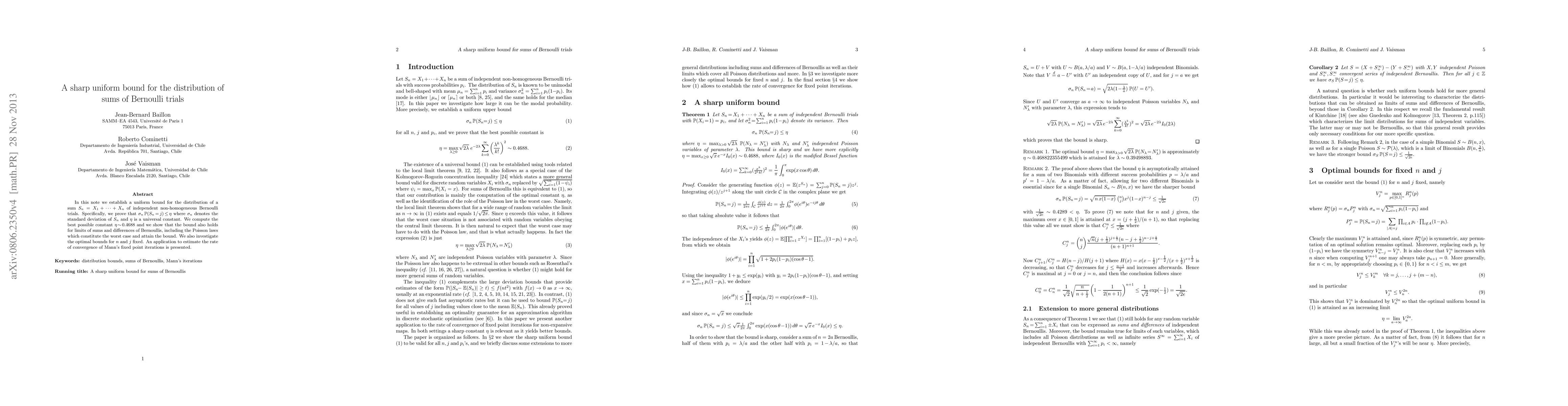 In this note we establish a uniform bound for the distribution of a sum $S_n=X_1+\cdots+X_n$ of independent non-homogeneous Bernoulli trials. Specifically, we prove that $\sigma_n \mathbb{P}(S_n\!=\!j)\leq\eta$ where $\sigma_n$ denotes the standard deviation of $S_n$ and $\eta$ is a universal constant. We compute the best possible constant $\eta\sim 0.4688$ and we show that the bound also holds for limits of sums and differences of Bernoullis, including the Poisson laws which constitute the worst case and attain the bound. We also investigate the optimal bounds for $n$ and $j$ fixed. An application to estimate the rate of convergence of Mann's fixed point iterations is presented.