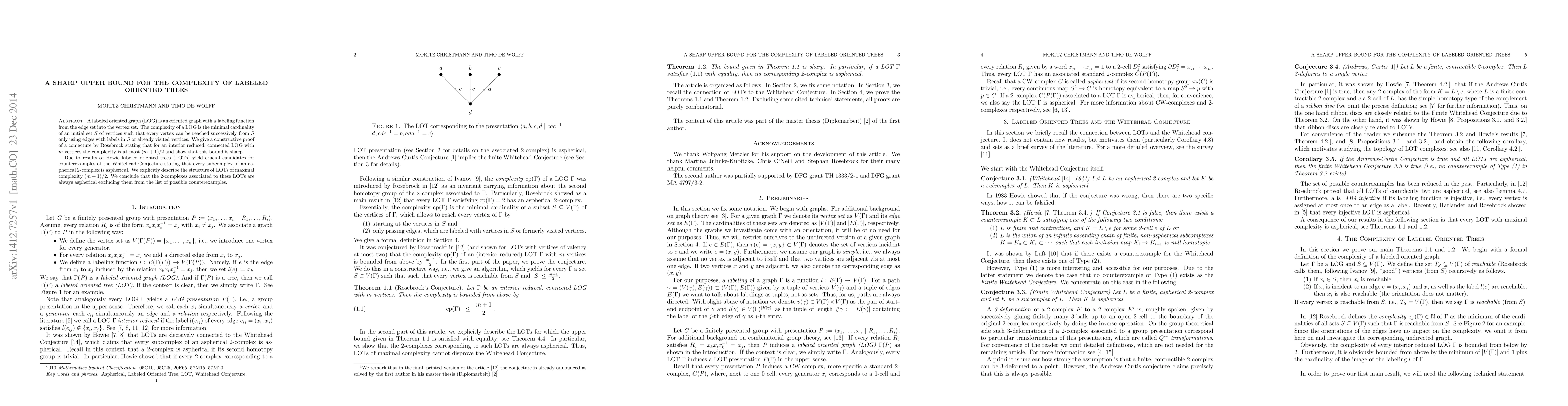 A labeled oriented graph (LOG) is an oriented graph with a labeling function from the edge set into the vertex set. The complexity of a LOG is the minimal cardinality of an initial set $S$ of vertices such that every vertex can be reached successively from $S$ only using edges with labels in $S$ or already visited vertices. We give a constructive proof of a conjecture by Rosebrock stating that for an interior reduced, connected LOG with $m$ vertices the complexity is at most $(m+1) / 2$ and show that this bound is sharp. Due to results of Howie labeled oriented trees (LOTs) yield crucial candidates for counterexamples of the Whitehead Conjecture stating that every subcomplex of an aspherical 2-complex is aspherical. We explicitly describe the structure of LOTs of maximal complexity $(m+1)/2$. We conclude that the 2-complexes associated to these LOTs are always aspherical excluding them from the list of possible counterexamples.