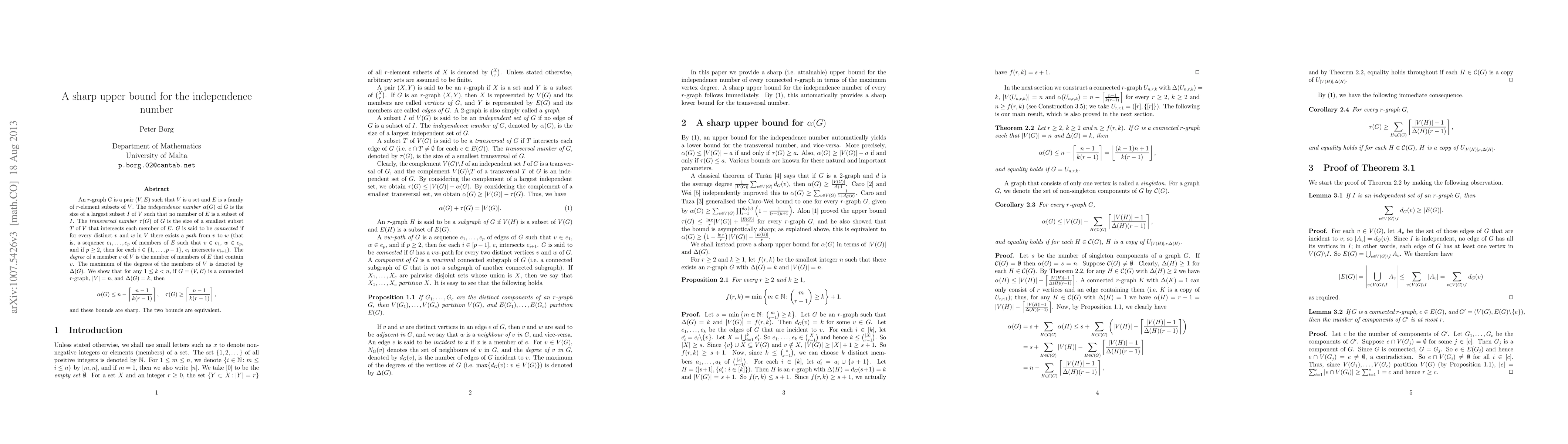 An $r$-graph $G$ is a pair $(V,E)$ such that $V$ is a set and $E$ is a family of $r$-element subsets of $V$. The \emph{independence number} $\alpha(G)$ of $G$ is the size of a largest subset $I$ of $V$ such that no member of $E$ is a subset of $I$. The \emph{transversal number} $\tau(G)$ of $G$ is the size of a smallest subset $T$ of $V$ that intersects each member of $E$. $G$ is said to be \emph{connected} if for every distinct $v$ and $w$ in $V$ there exists a \emph{path} from $v$ to $w$ (that is, a sequence $e_1, \dots, e_p$ of members of $E$ such that $v \in e_1$, $w \in e_p$, and if $p \geq 2$, then for each $i \in \{1, \dots, p-1\}$, $e_i$ intersects $e_{i+1}$). The \emph{degree} of a member $v$ of $V$ is the number of members of $E$ that contain $v$. The maximum of the degrees of the members of $V$ is denoted by $\Delta(G)$. We show that for any $1 \leq k < n$, if $G = (V,E)$ is a connected $r$-graph, $|V| = n$, and $\Delta(G) = k$, then \[\alpha(G) \leq n - \left \lceil \frac{n-1}{k(r-1)} \right \rceil, \quad \tau(G) \geq \left \lceil \frac{n-1}{k(r-1)} \right \rceil,\] and these bounds are sharp. The two bounds are equivalent.