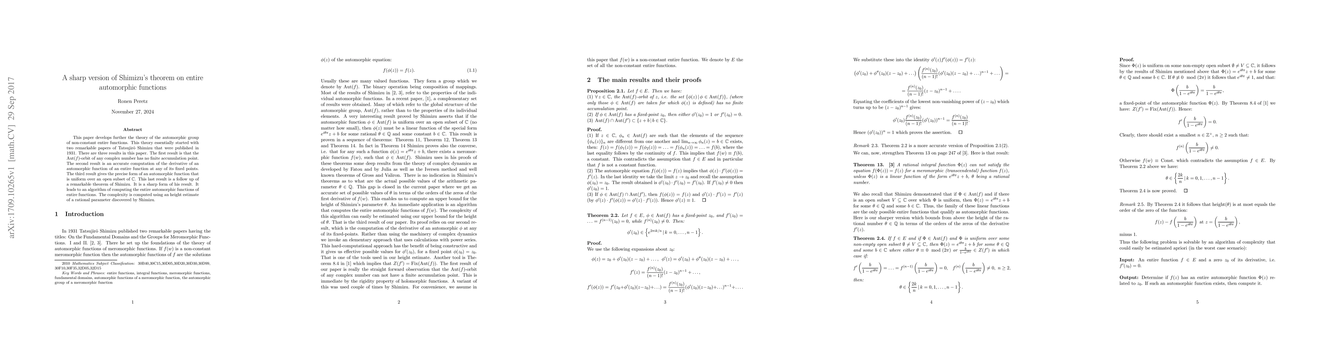 This paper develops further the theory of the automorphic group of non-constant entire functions. This theory essentially started with two remarkable papers of Tatsujir\^o Shimizu that were published in 1931. There are three results in this paper. The first result is that the ${\rm Aut}(f)$-orbit of any complex number has no finite accumulation point. The second result is an accurate computation of the derivative of an automorphic function of an entire function at any of its fixed points. The third result gives the precise form of an automorphic function that is uniform over an open subset of $\mathbb{C}$. This last result is a follow up of a remarkable theorem of Shimizu. It is a sharp form of his result. It leads to an algorithm of computing the entire automorphic functions of entire functions. The complexity is computed using an height estimate of a rational parameter discovered by Shimizu.