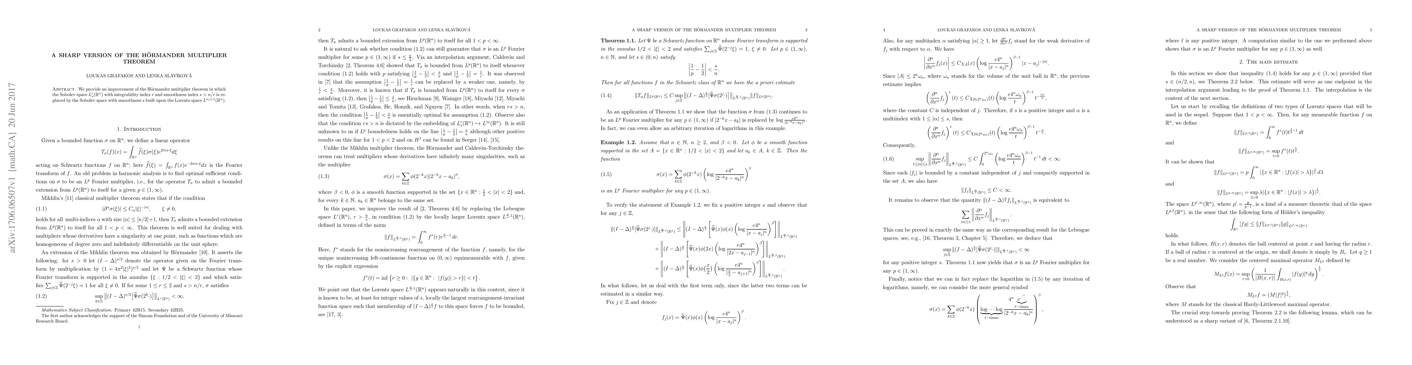 This paper improves the H\"ormander multiplier theorem by replacing the Sobolev space $L^r_s(\mathbb R^n)$ with a Sobolev space based on the Lorentz space $L^{n/s,1}(\mathbb R^n)$, enhancing the smoothness conditions.