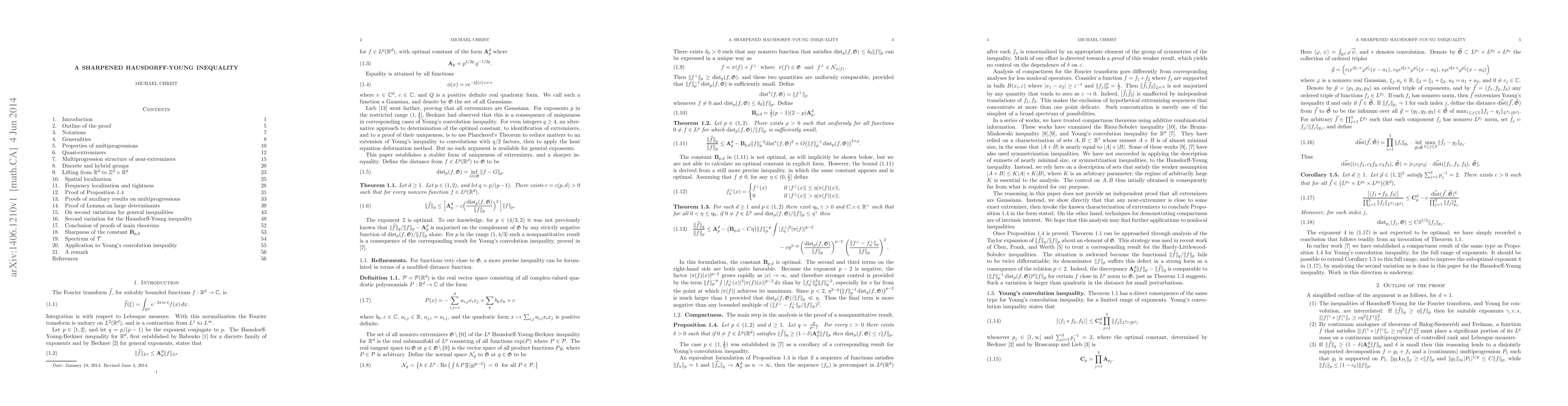 This paper sharpens the Hausdorff-Young inequality by establishing an improved upper bound for functions close to the Gaussians, which are the extremizers. The authors introduce a negative second term proportional to the squared distance from the extremizers, with its own sharp constant, and prove the precompactness of any extremizing sequence using additive combinatorial inverse theorems.