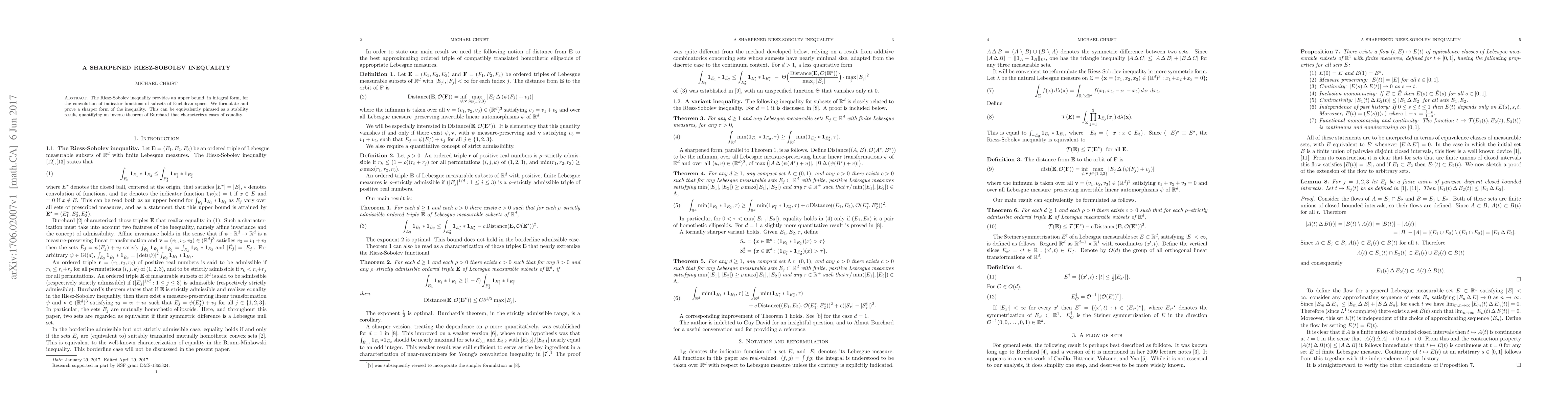 The paper formulates and proves a sharper version of the Riesz-Sobolev inequality, providing an improved upper bound for convolutions of indicator functions, and also establishes a stability result that characterizes cases of equality based on Burchard's inverse theorem.