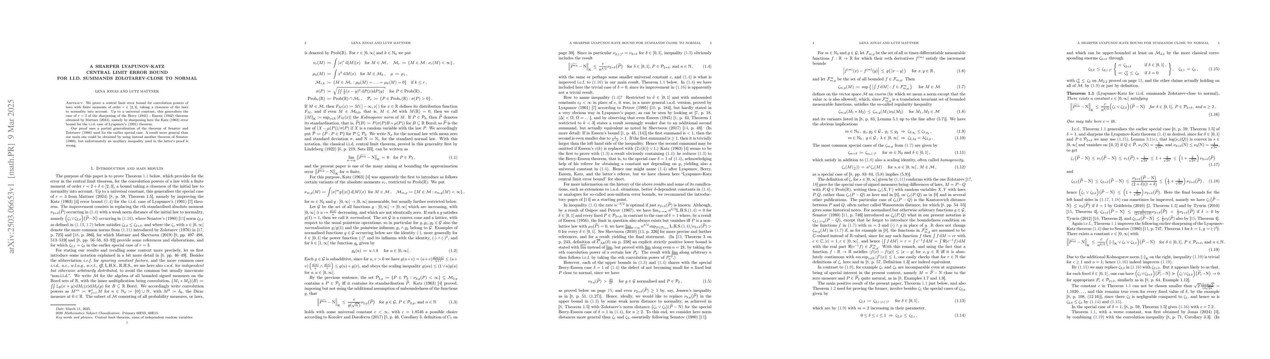 The paper presents a proof of a sharper Lyapunov-Katz central limit error bound for i.i.d. summands, incorporating a measure of closeness to normality using Zolotarev distances.